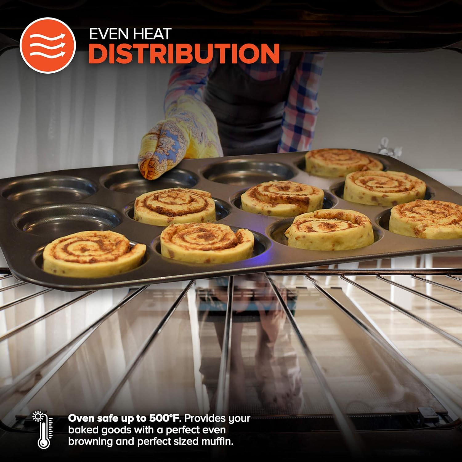 - Even heat distrubution; During the baking process, our muffin top pan will provide your baked goods with a perfect even browning and perfect sized muffin; Oven safe up to 500°F