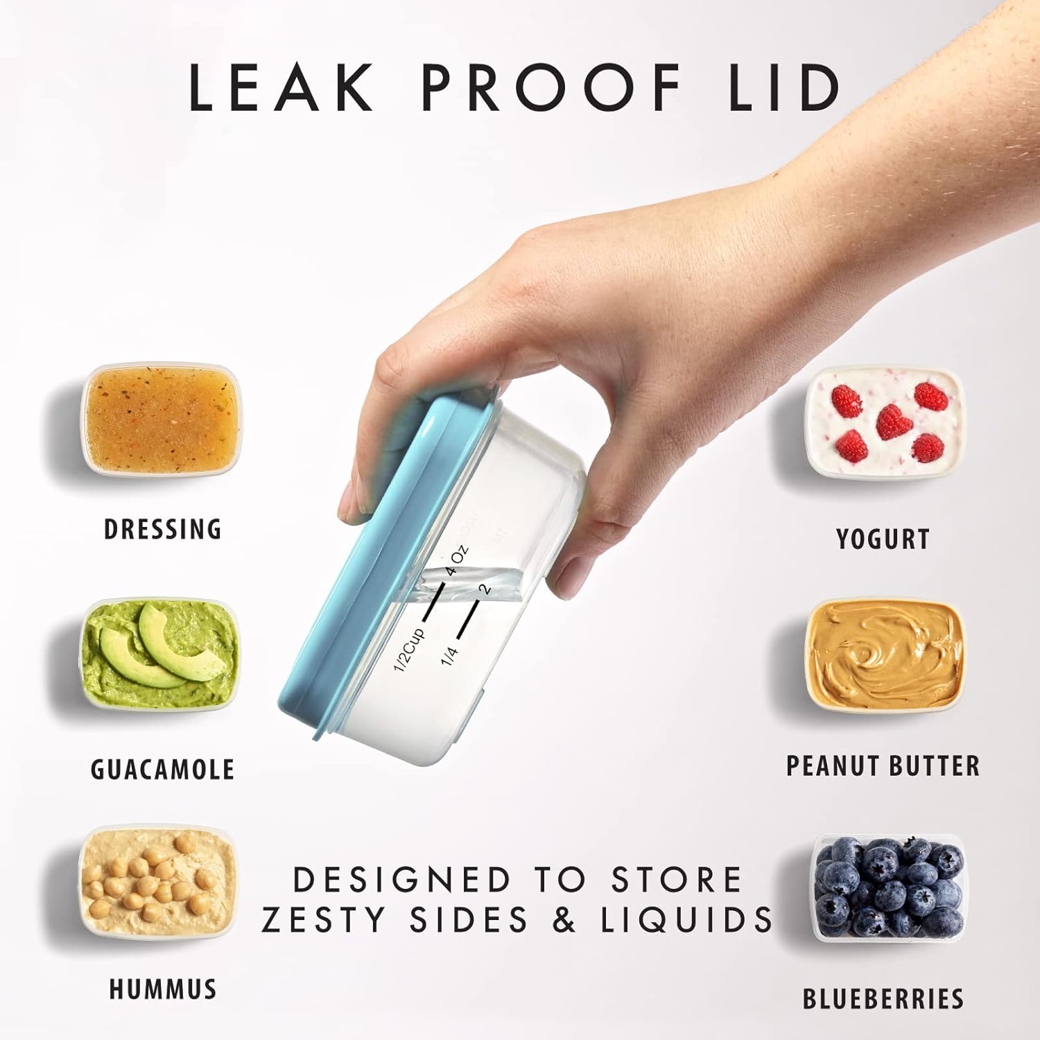 - PERFECT FOR SIDES: Set of five ½ cup containers are perfect for packing dips, dressings, hummus or nuts