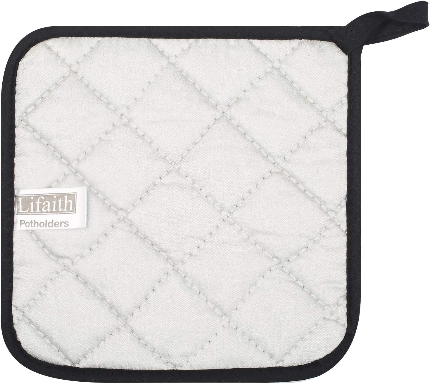 - 100% terry looped cotton on one side and a heat resistant silverstone lining on the other. Quilting allows for easy flexibility in this potholder, offer durability and grip. Hanging loop for easy storage.