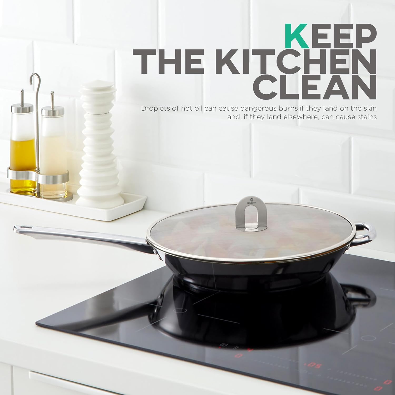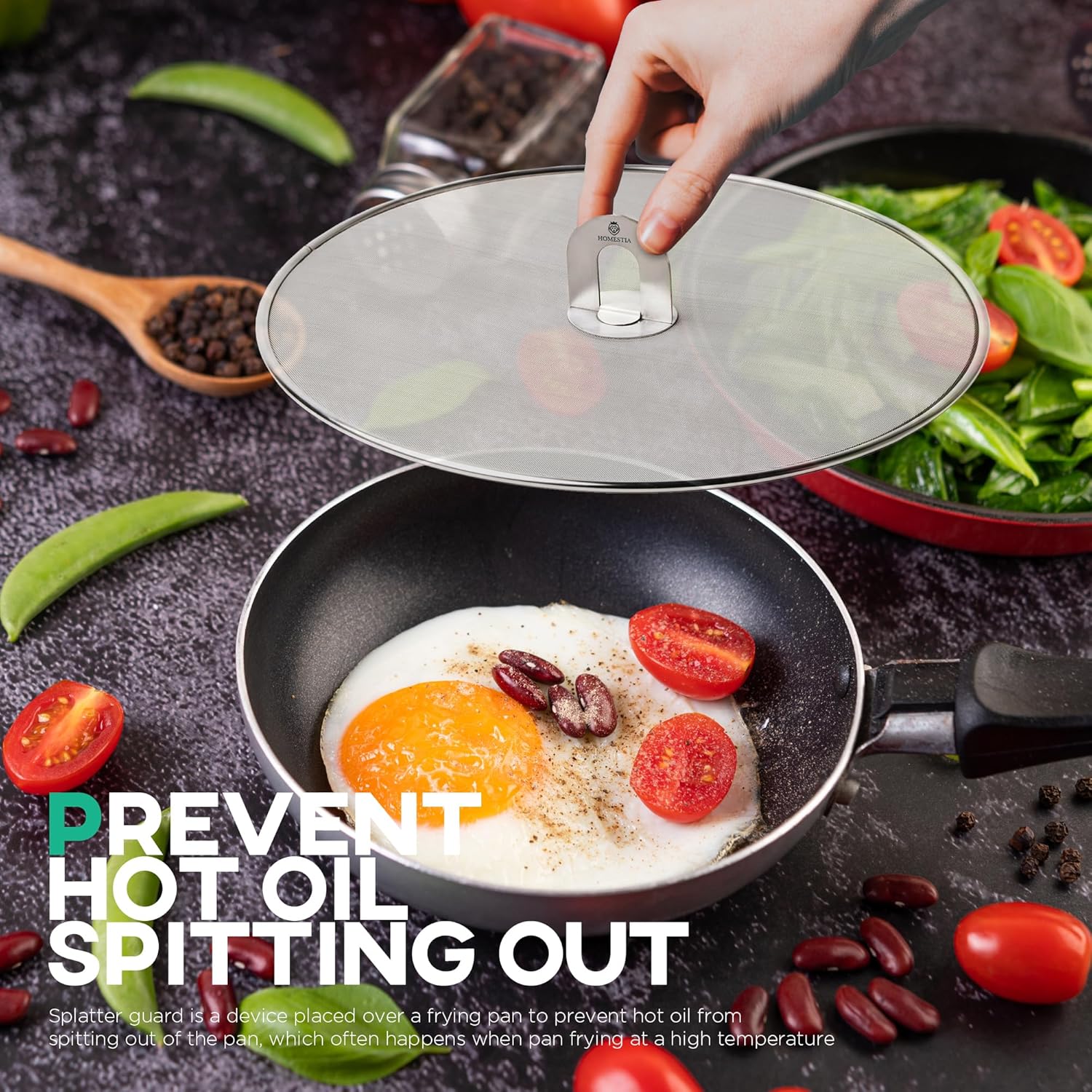 - OPERATION: The stainless steel mesh splatter screen is the best option for most high-heat frying and sautéing, as it allows optimal evaporation and is incredibly sturdy even at the highest heat. The extra-fine mesh blocks water and oil splatters and won’t warp and rust over time. It is exceptionally durable due to the rigid metal spine.