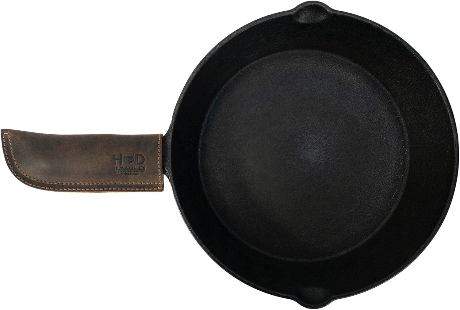 - DURABLE DOUBLE LEATHER LAYER OFFERS PROTECTION UP TO 450-DEGREES: The double layered leather provides excellent insulation to prevent any burns as you take the Skillet off the fire, giving you a protection against high temperatures. Note that these Rustic Leather Pan handles are designed for levels of heat-proofing, they are not fireproof – do not place in the oven.