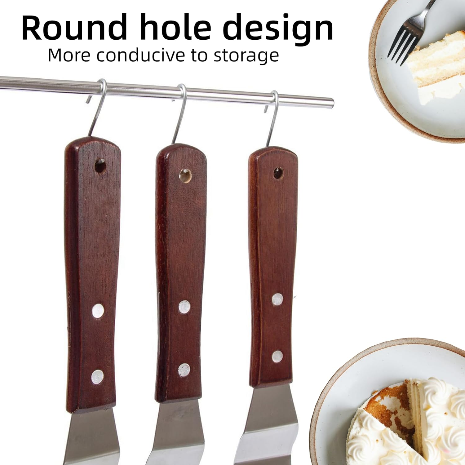 - The ergonomic wood handle with hole of these angled icing spatula is lightweight and feel very comfortable to grip in your hand. The hole make it easy to hang and storage.