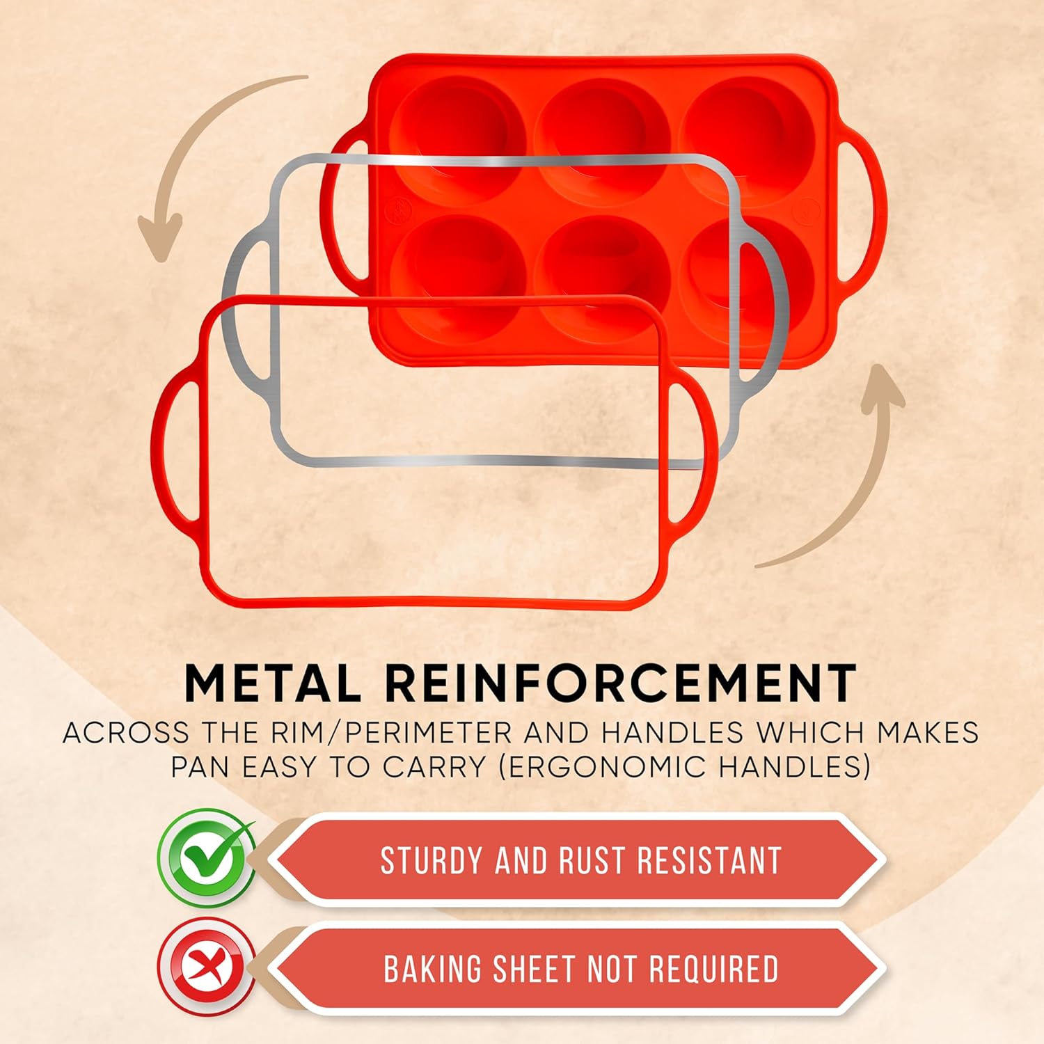 - No More Floppy Mess – Built-in Metal Frame for Stability: Say goodbye to spills and warping! The Bake Boss muffin pan silicone design includes reinforced metal handles, so you can move your muffins from counter to oven without needing a support tray.