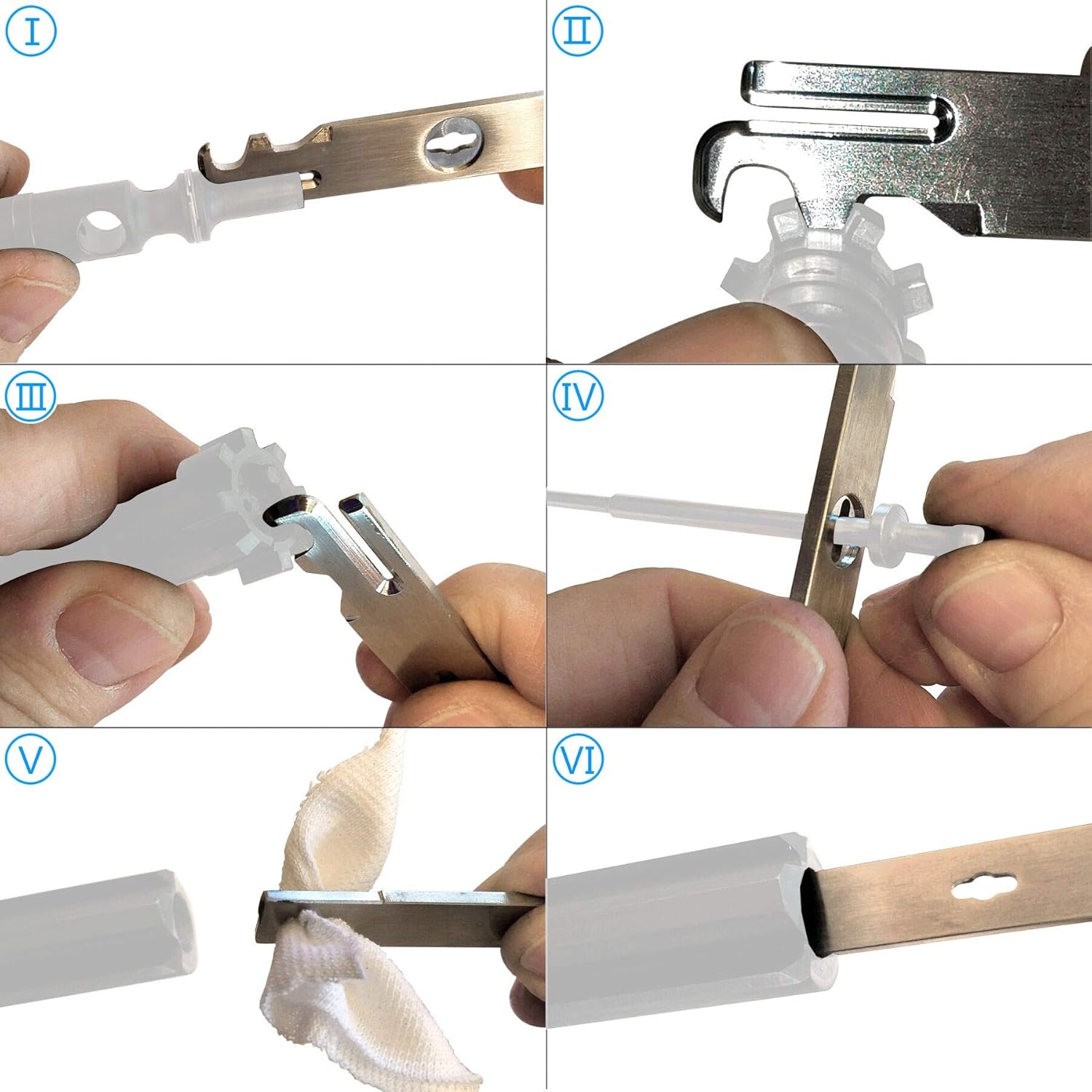 - This compact handy gun cleaning tool is made of sturdy light steel. Each surface is precision cut to match different surfaces on the bolt carrier group