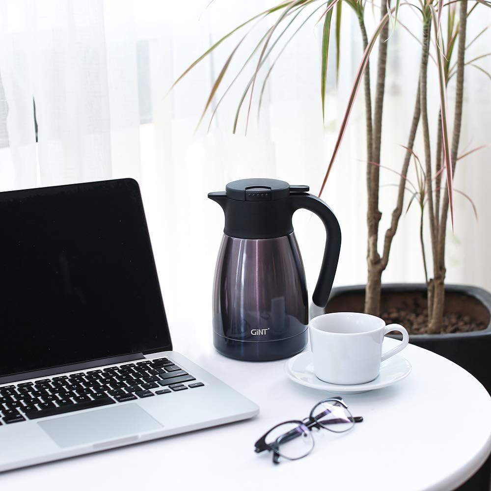 - USER FRIENDLY: GiNT thermal carafe features extra wide top opening, easy for cleaning and adding ice cubes; Simple-push button enables single-hand pouring without leaking, dripping or spilling; Ideal used for bedside, restaurant, office, party, camping, travel insulated coffee carafes.