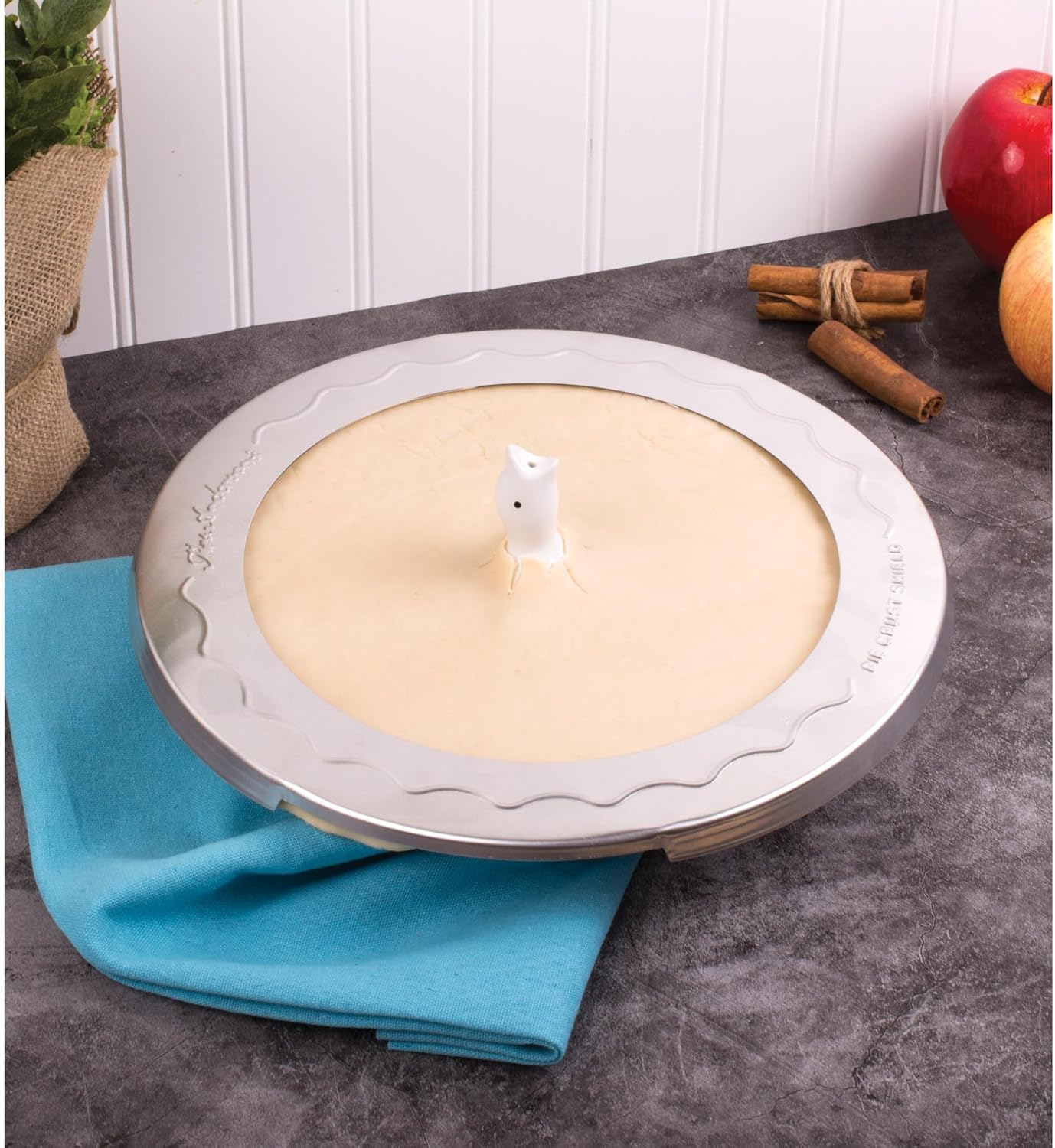 - Steam vents through the bird’s beak to keep pie filling from bubbling over; top crust is supported by the bird’s shoulders, eliminating bowed crust