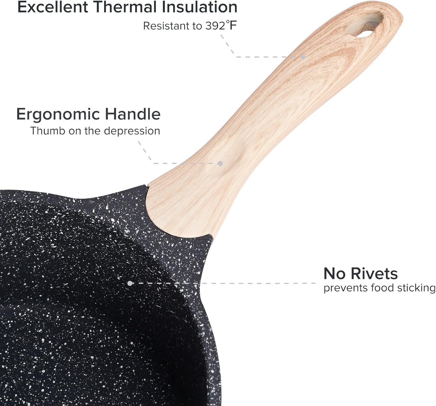 - [Heat-Insulating Handle] - More ergonomic wood grain Bakelite handle for a comfortable grip. Good heat resistance allows it to stay cool while cooking. The safe temperature for nonstick pot is 302℉ (long time high temperature will shorten the life of the handle)