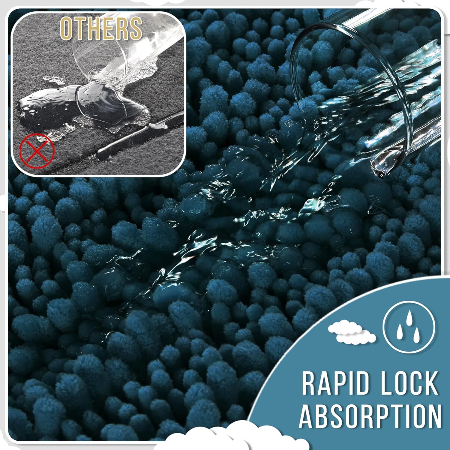 - Massive Water Absorption in Seconds: 5X faster than other materials mats, Yimobra bath mat absorbs 1000ml of water in 3 seconds. The vertical fiber channels lock moisture away from the surface, keeping your bathroom floor dry and discouraging damp environments. Perfect as a shower exit guard or sink splash catcher