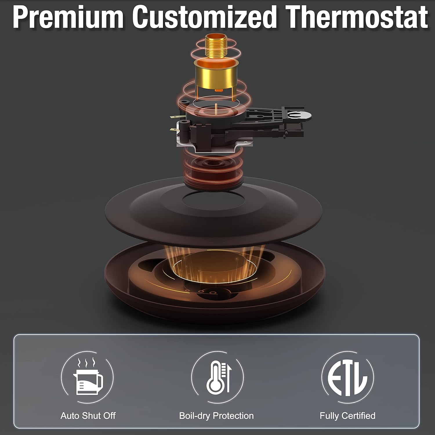 - Effective Operation – Equipped with the boil-dry protection and auto-shutoff safety function, the kettle will turn off automatically once the water completely boiled so that it effectively saves more energy and time than your microwave or stove. The 2L big capacity can handle around 7 cups and enough for you to prefer a full day of coffee, tea, hot chocolate at a time.