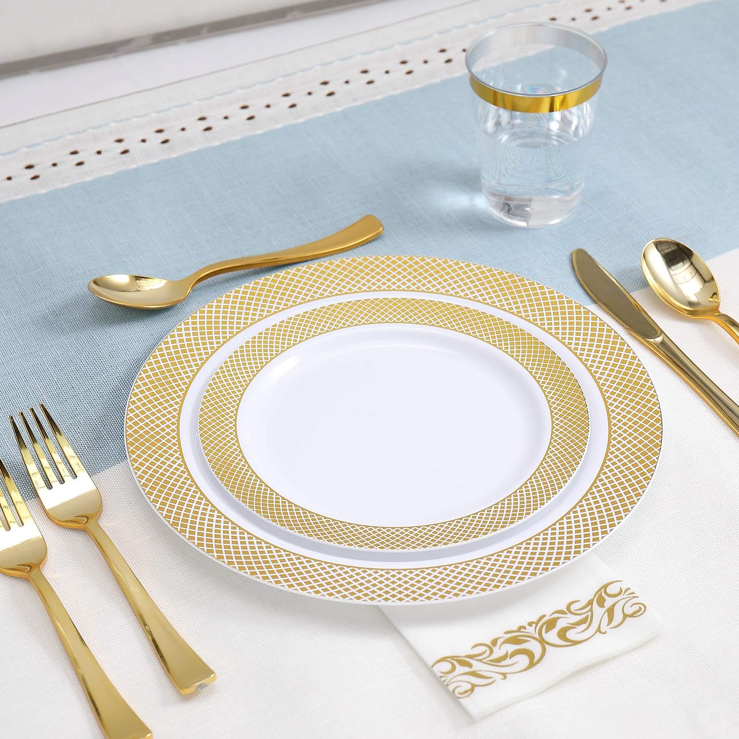 FOCUSLINE 175 Count Gold Dinnerware Set for 25 Guests - Disposable Plastic Plates with Gold Grid, Includes 25 Dinner & Salad Plates, Cups, Napkins, Cutlery Set for Wedding Parties