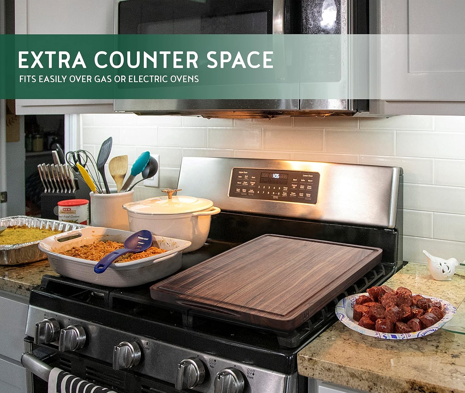 - REVERSIBLE, JUICE GROOVE, BUILD-IN HANDLES – These wooden cutting board feature a large smooth reversible surface for cutting different things separately. Wide and deep juice groove to catch excess liquid during food prep. And built-in handles for easy taking and moving. 5 sizes available to cover all your needs. Work perfect for carving grilled brisket, beef, pork, or ribs at barbecues, or as a cheese board, charcuterie board, serving tray.