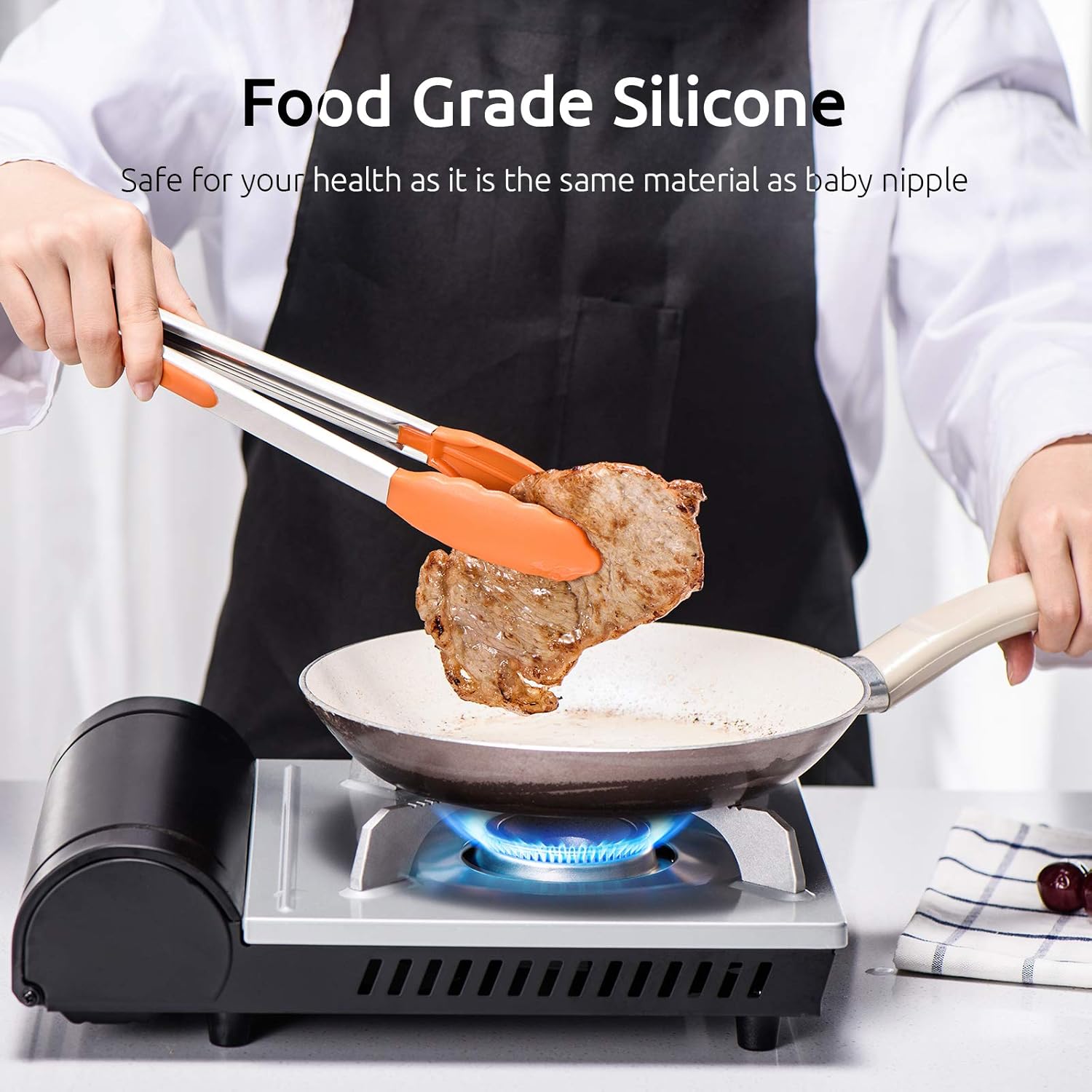 Kitchen Tongs, U-Taste 7/9/12 inches Cooking Tongs, with 600ºF High Heat-Resistant Non-Stick Silicone Tips, 18/8 Stainless Steel Handle, for Food Grill, Salad, BBQ, Frying, Serving, Pack of 3(Orange)