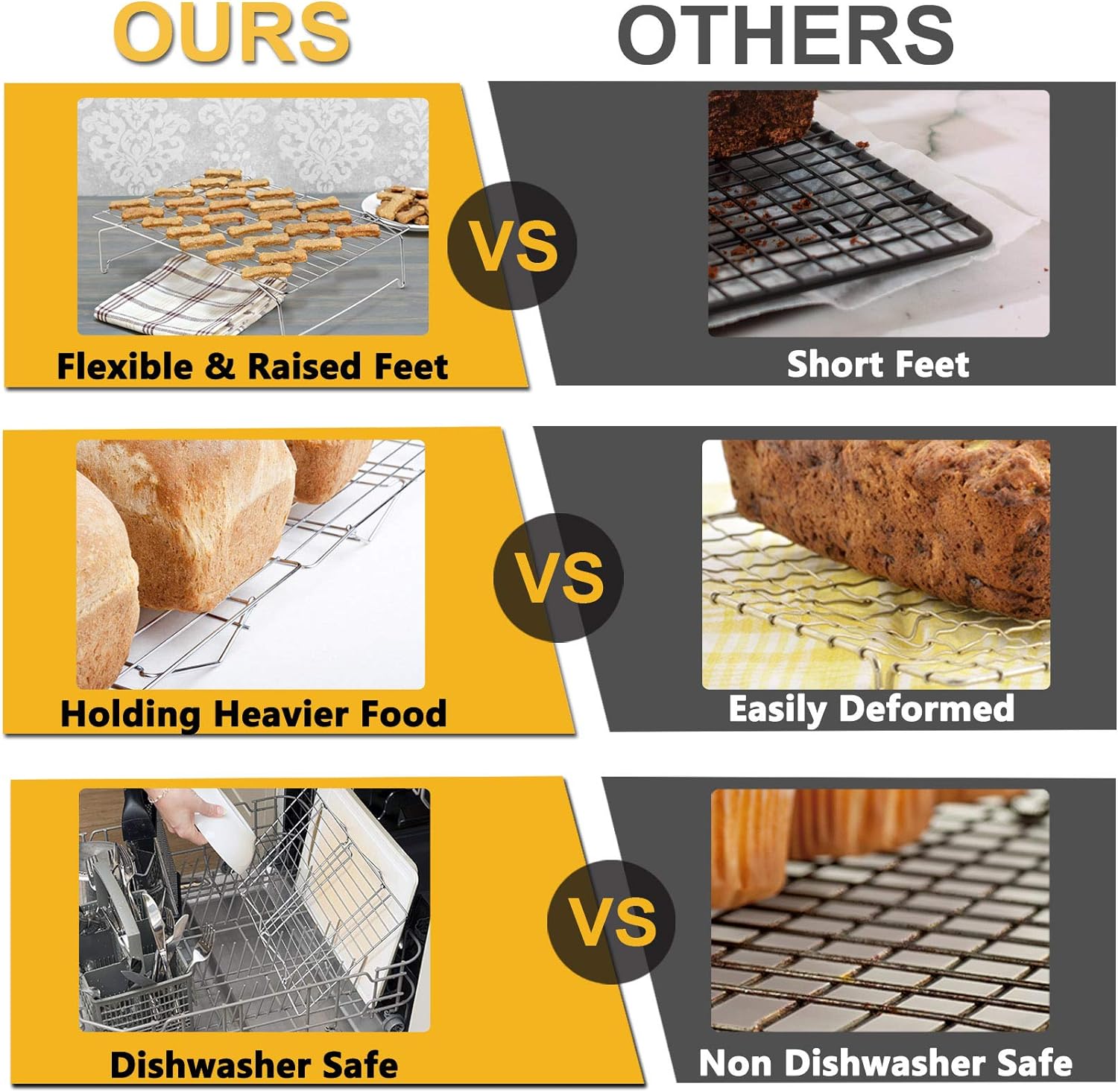 - FIRMLY WELD & SMOOTH SURFACE - The parallel lines are solidly and densely welded to keep food from falling through, The feet with the arc design help the cooling rack stand stably without sliding, Smooth edges without sharp angles, Roundly protect your hand, Mirror finished surface always keep a shiny appearance