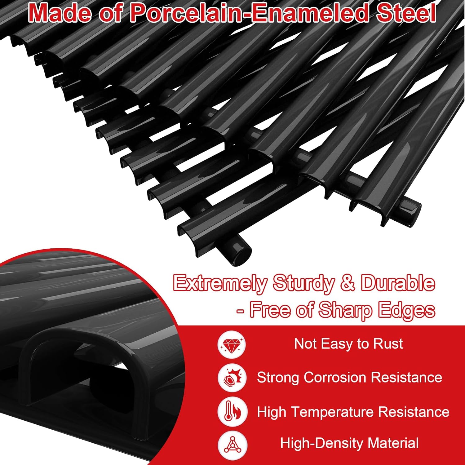 - 【Includes】Set of 2 porcelain-enameled grill grates. Enough sturdy for long-term use. The Porcelain-enameled finish keeps food from sticking and distributes heat evenly at high grilling temperatures. Evenly heat and retain superbly, provide professional sear.