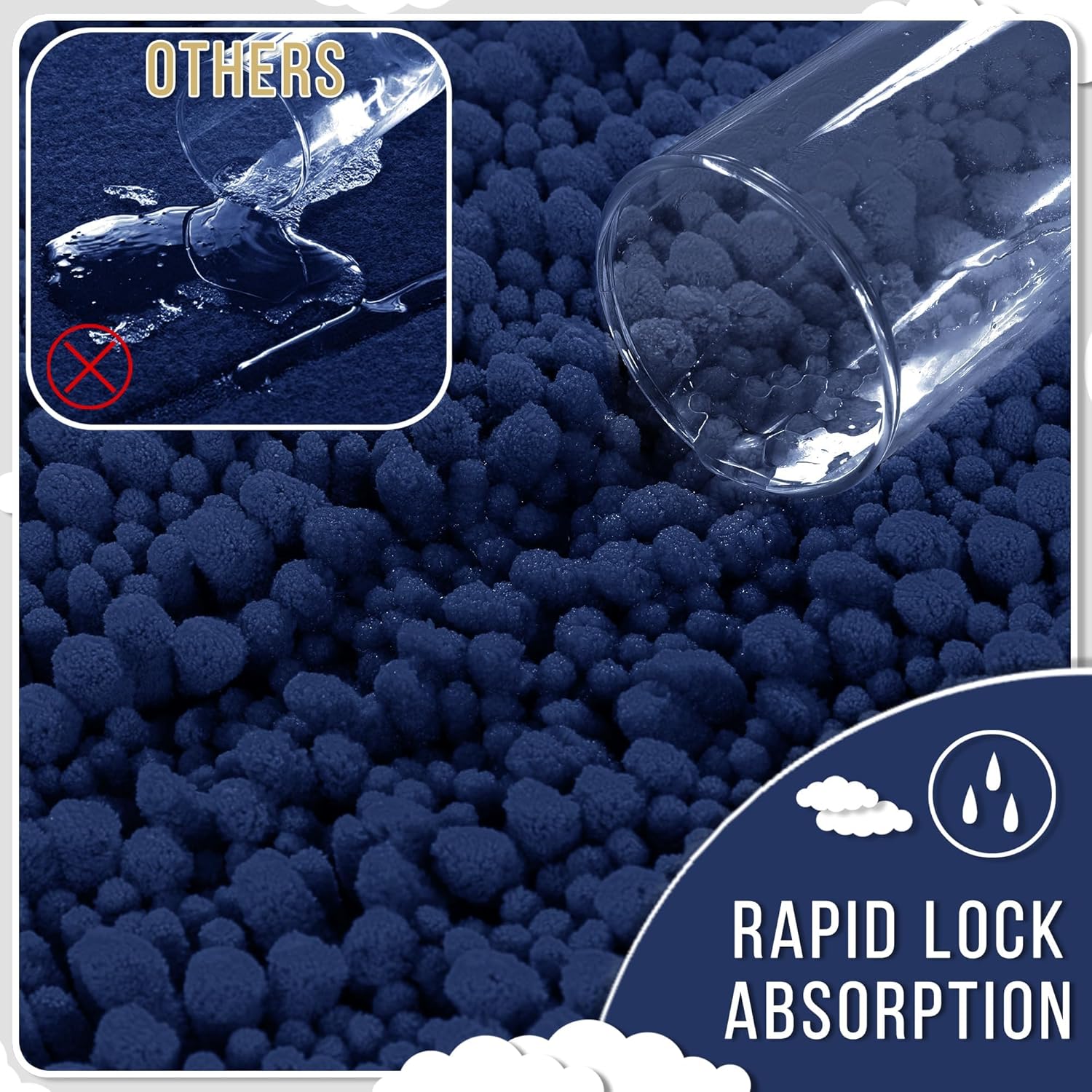 - Massive Water Absorption in Seconds: 5X faster than other materials mats, Yimobra bath mat absorbs 1000ml of water in 3 seconds. The vertical fiber channels lock moisture away from the surface, keeping your bathroom floor dry and discouraging damp environments. Perfect as a shower exit guard or sink splash catcher