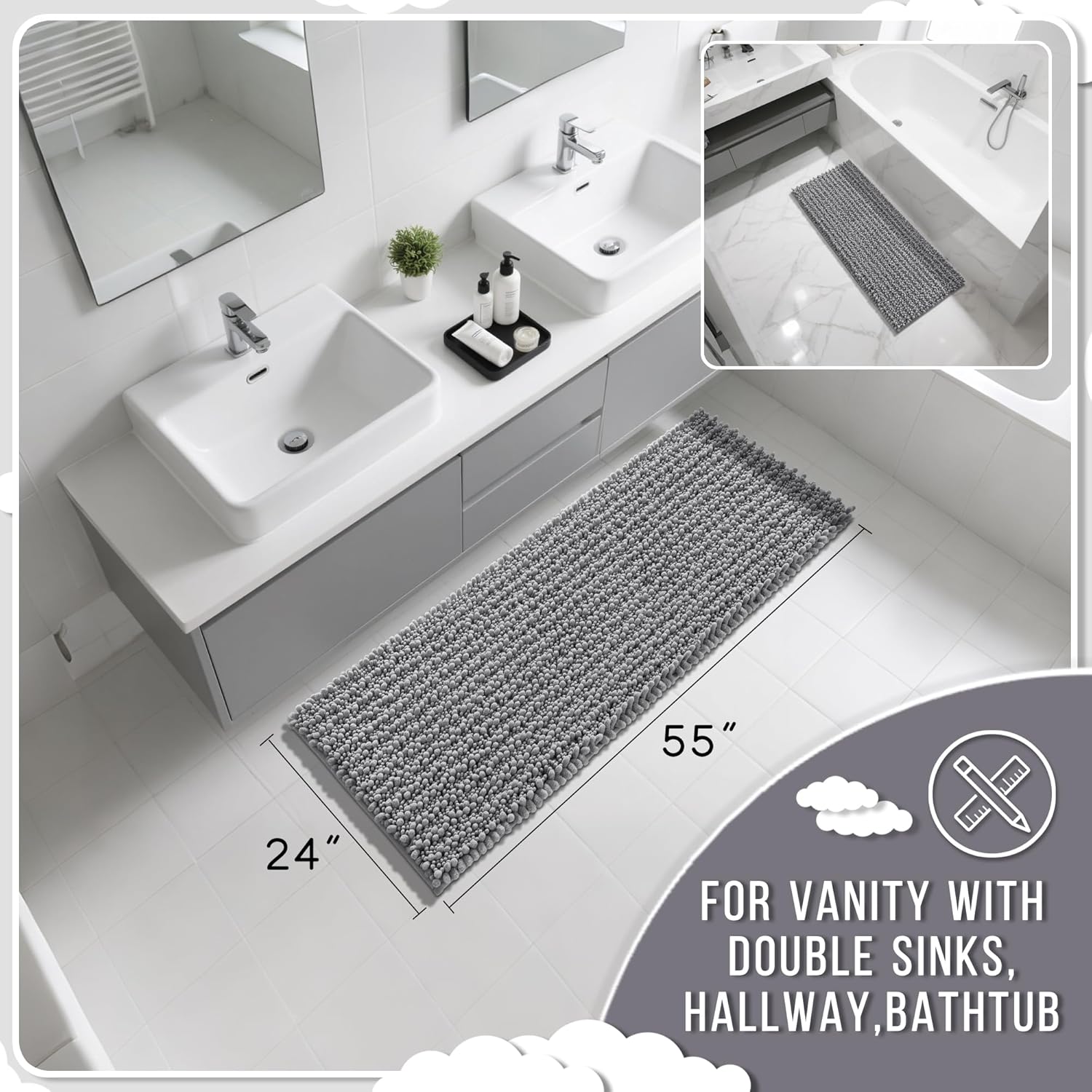 Yimobra Bathroom Runner Rug 55x24 Inch - Extra Long Non Slip Chenille Bath Mat, Soft & Absorbent, Machine Washable Shaggy Hallway Carpet for Vanity Tub Shower, Gray Home Decor Accessories
