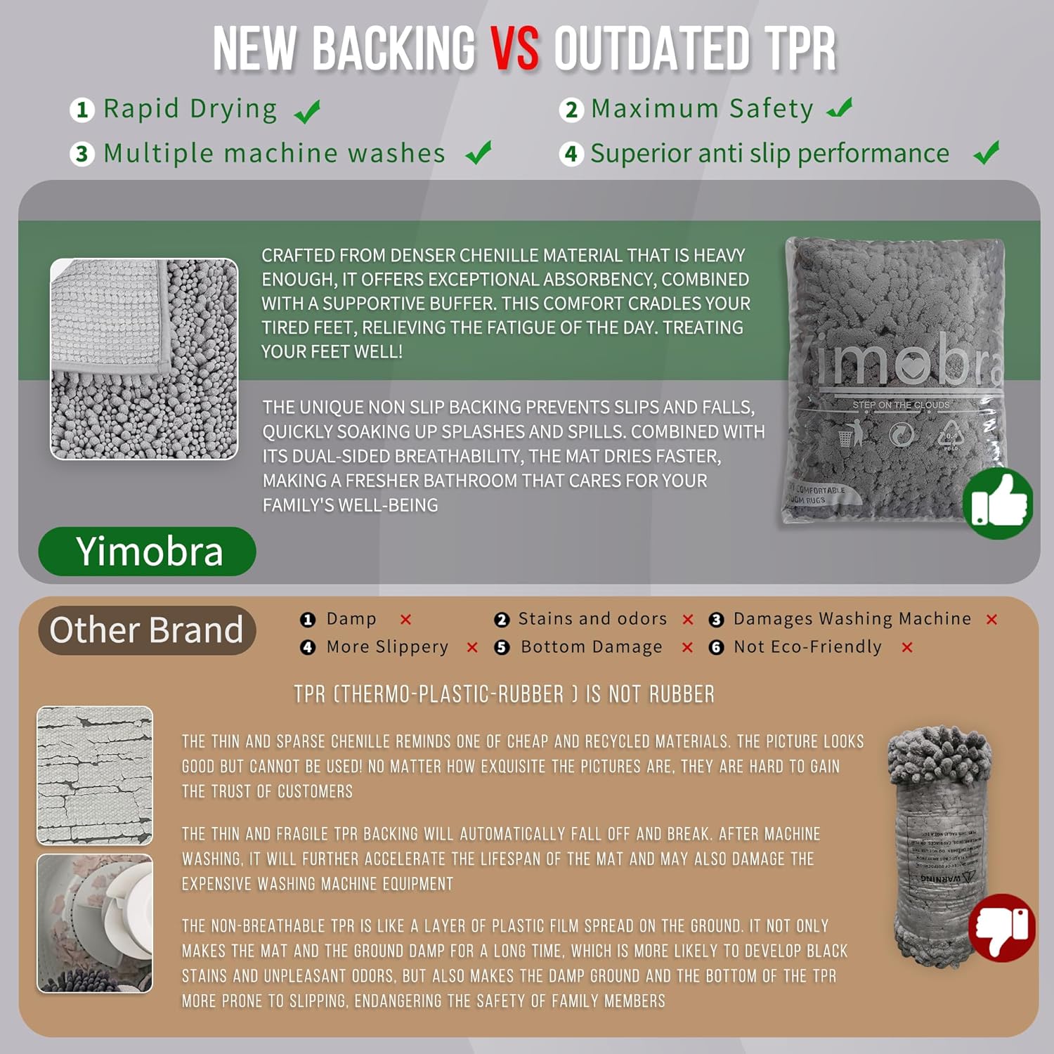 - Total Grip Safety & Quick Dry: Yimobra bath rug features a feather-light yet ultra-grippy hot-melt backing that stays firmly in place on wet surfaces. Its vertical air-channel chenille fibers ensure rapid and complete dryness, providing instant dry safety the moment you step out of the shower. The product is tested for harmful substances, performance, longevity, and emissions in accordance with the OEKO-TEX Standard 100