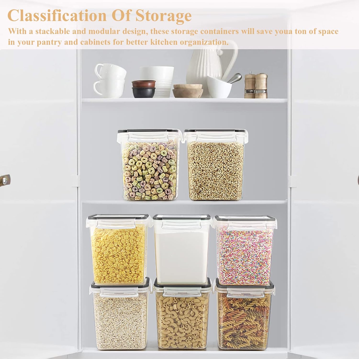 - MUITI-PURPOSE: Includes 8 (2.5L/85oz--Length/width/height: 5.3inch/5.3inch/6.3inch) Airtight Containers Cereal Containers; Store your favorite foods safely into these efficient containers; Perfect for baking supplies, cereal, rice, sugar, flour, pasta, grain, snacks, coffee, tea, nuts; Freezer & dishwasher safe