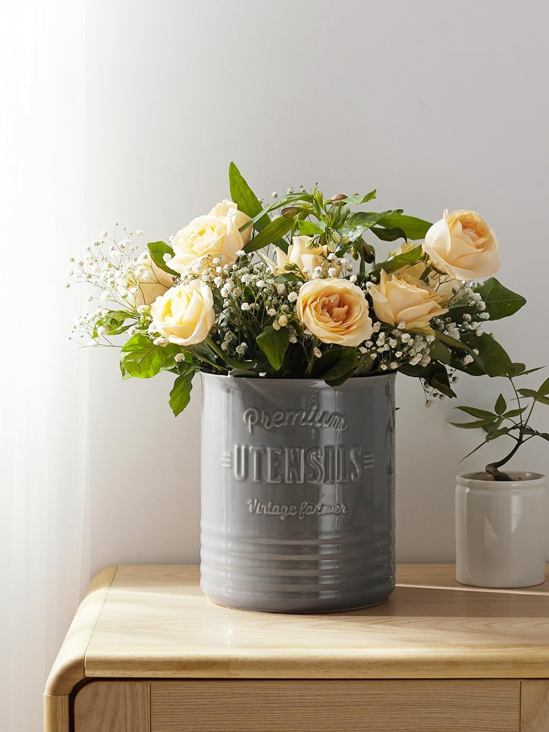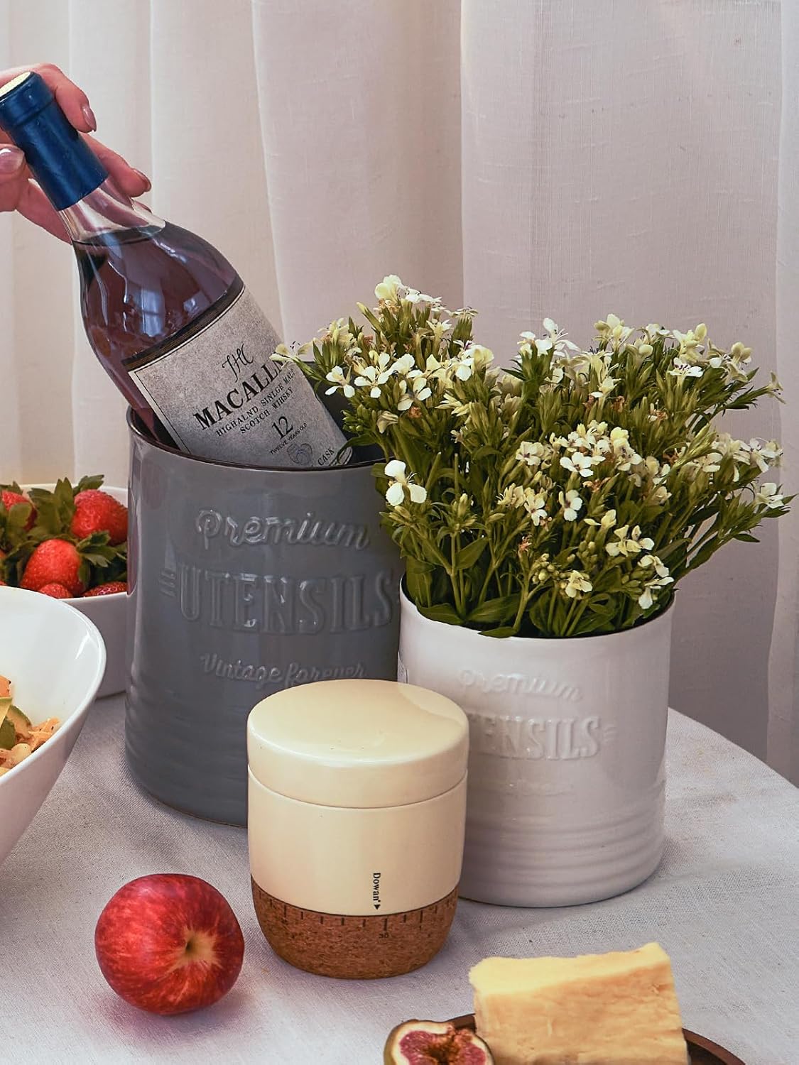 DOWAN 7.2″ Extra Large Kitchen Utensil Holder - Farmhouse Utensil Holder for Countertop - Ceramic Utensil Crock with Protection Cork Mat - Kitchen Decor & Housewarming Gift (Grey)