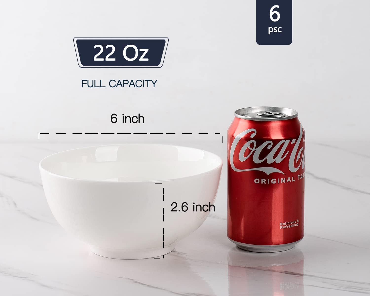 DELLING Ultra-Strong 22 Ounce Soup Bowls, Cereal Bowl, 6 inch Bowls Set, White Ceramic Bowls, White Bowls for Kitchen, Snack Rice Pasta Salad Oatmeal, Set of 6, Dishwasher & Microwave Safe