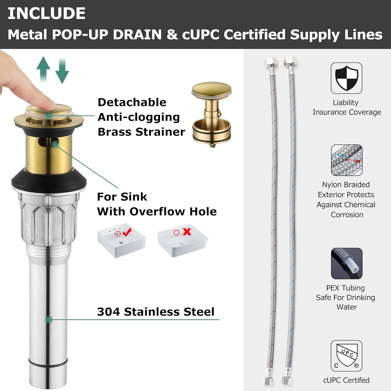 - All-Inclusive Package: Includes a solid metal pop-up drain assembly and cUPC certified faucet supply lines for a complete, hassle-free installation.
