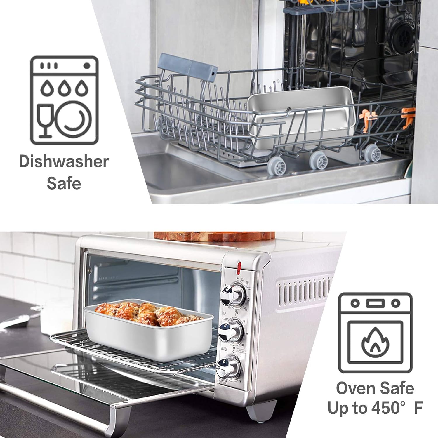 - OVEN & DISHWASHER SAFE - Meatloaf pans oven safe up to 450 ℉, Brushed finished baking pan easily clean up and quickly release, dishwasher safe save your time and less trouble, Recommend to use grease or parchment paper can reduce food sticking