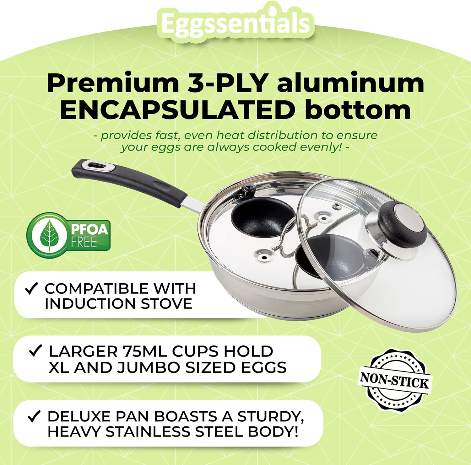 - HIGH-QUALITY MATERIAL AND PERFORMANCE – Unlike the delicate poacher pans on the market, this deluxe pan boasts a sturdy, heavy stainless steel body that is suitable for use with all stove types, including induction. Premium 3-PLY aluminum ENCAPSULATED bottom eliminates hot spots and provides fast, even heat distribution to ensure your eggs are always cooked evenly, so you never have to worry about over- or under-cooking your eggs.
