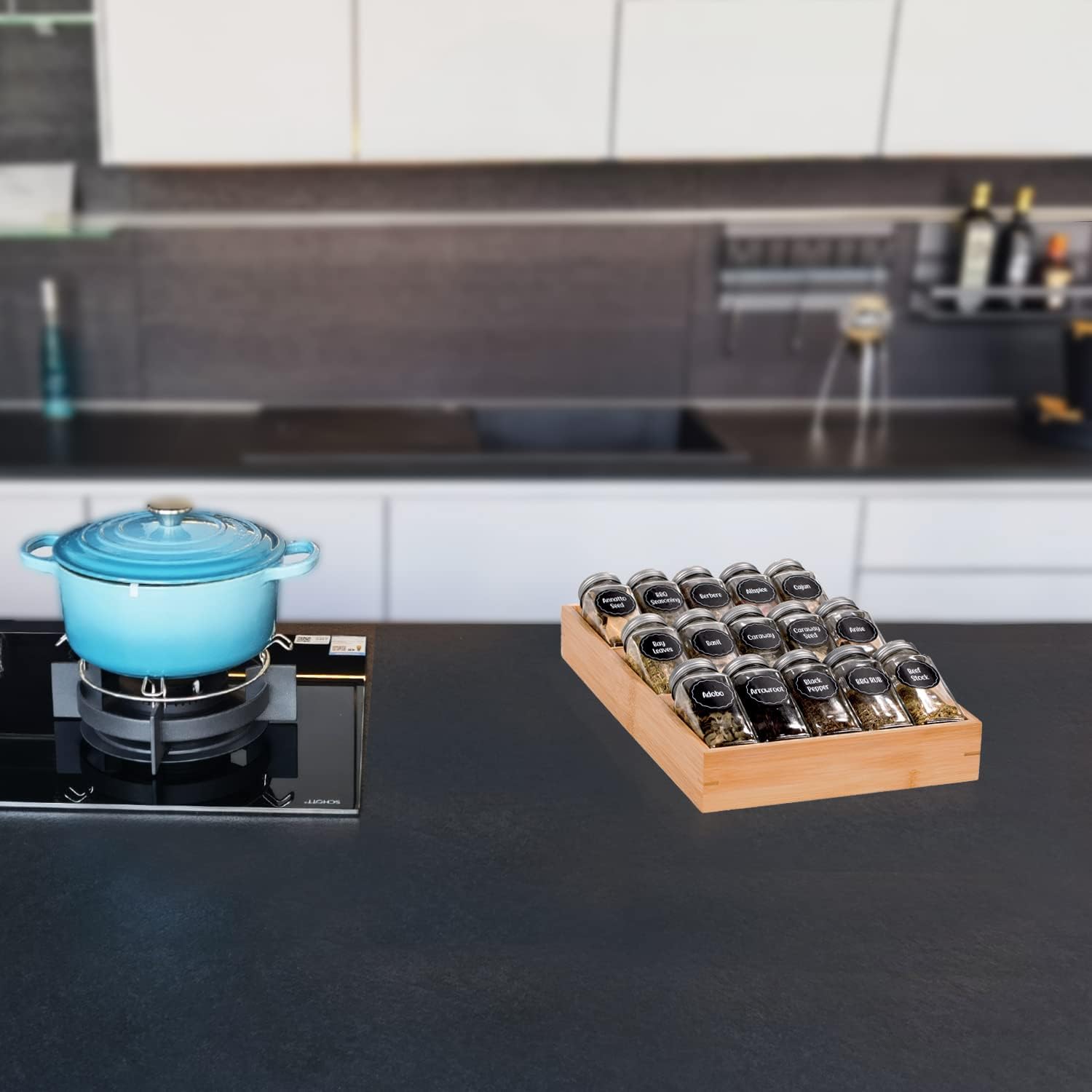 - ⚠Please Measure Your Drawer Size Before Purchasing: The size of this spice rack is: 15 x 9.7 x 2 inches. Fits more than 4 inch deep drawers. Please note: When measuring the drawer size, the internal dimensions should be measured and the interference of the drawer slides and handles should be excluded. ❗❗(Spice Jars Not Included)