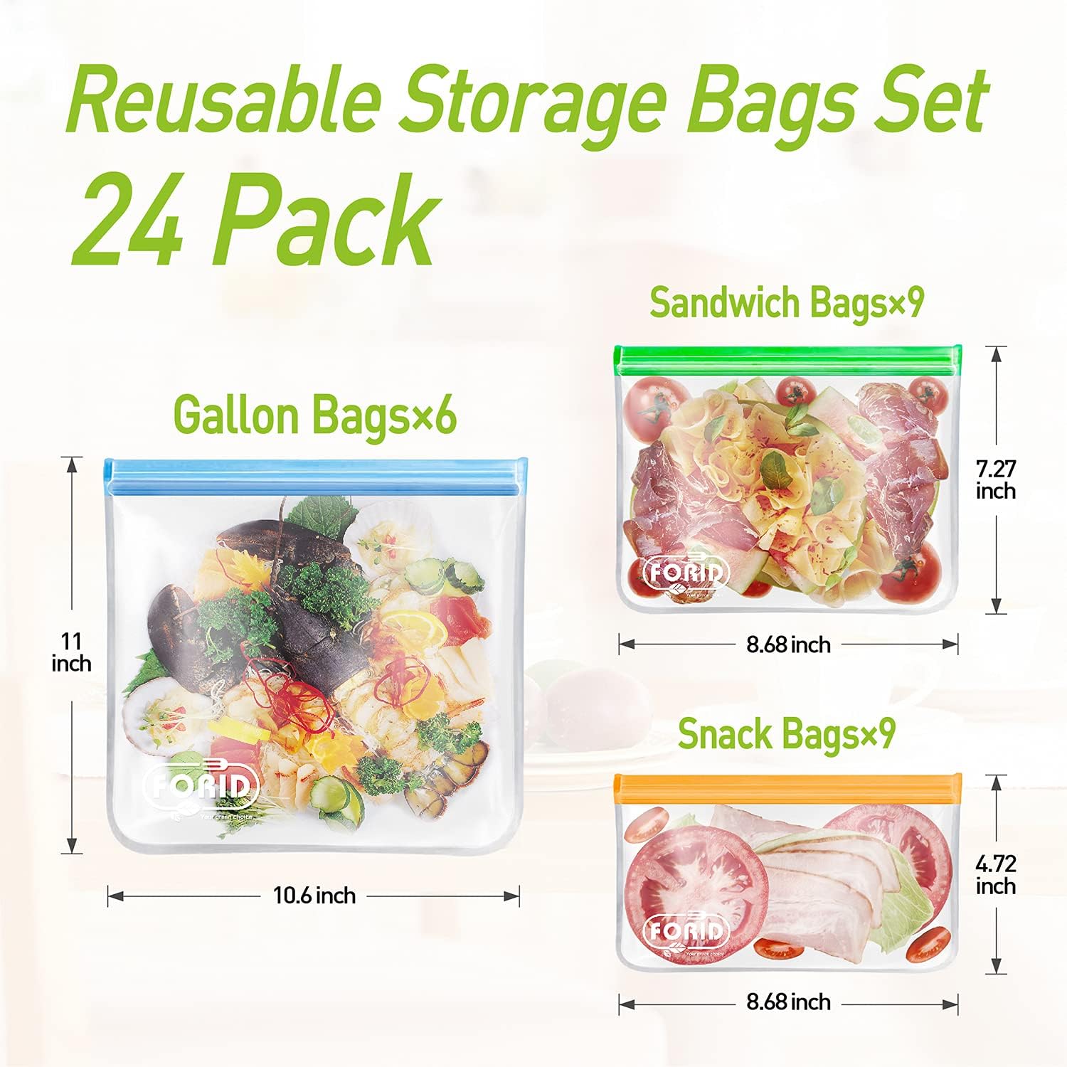 - Food Grad Material - Adopted upgrade food-grade material, FORID reusable storage bags are plastic-free and eco-friendly, meaning our reusable food storage bags are harmless to the environment when disposed or burned. Each reusable freezer bag is reusable for hundreds of times, saving up to 400+ disposable plastic bags, which not only can protect our earth, but also save our money.
