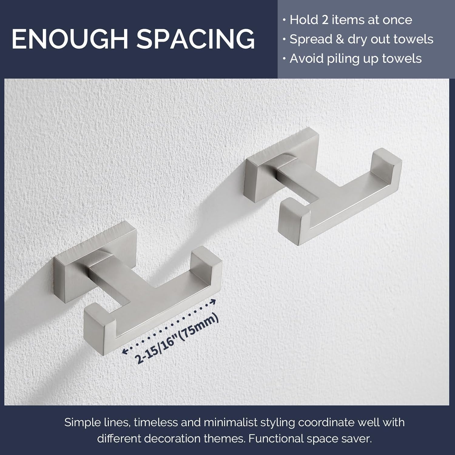- SUFFICIENT SPACING FOR DRYING: distance between the hooks is 2-15/16" (75mm), help air circulate and dry out damp towels without bunching up or getting too close, deburred edges to prevent fabrics from ripping
