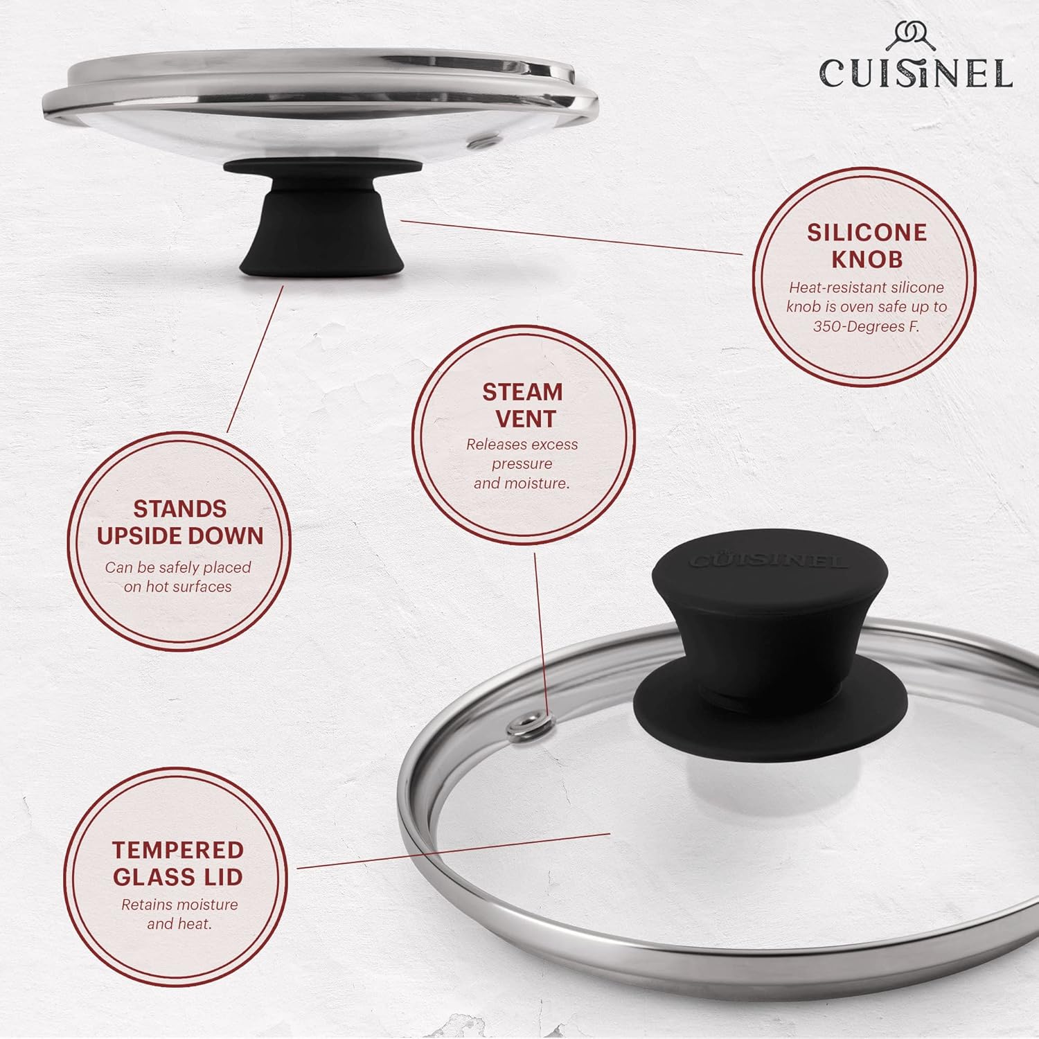 - STEAM VENT HOLE: Cuisinel's professional quality lids – now updated with steam vent holes to prevent liquid from boiling over. Vent holes allow just the right amount of moisture to evaporate easily so your food doesn't saturate in liquid. Vent holes make sure the glass lid doesn’t cloud up – allowing you to easily see cooking progress without removing lid.