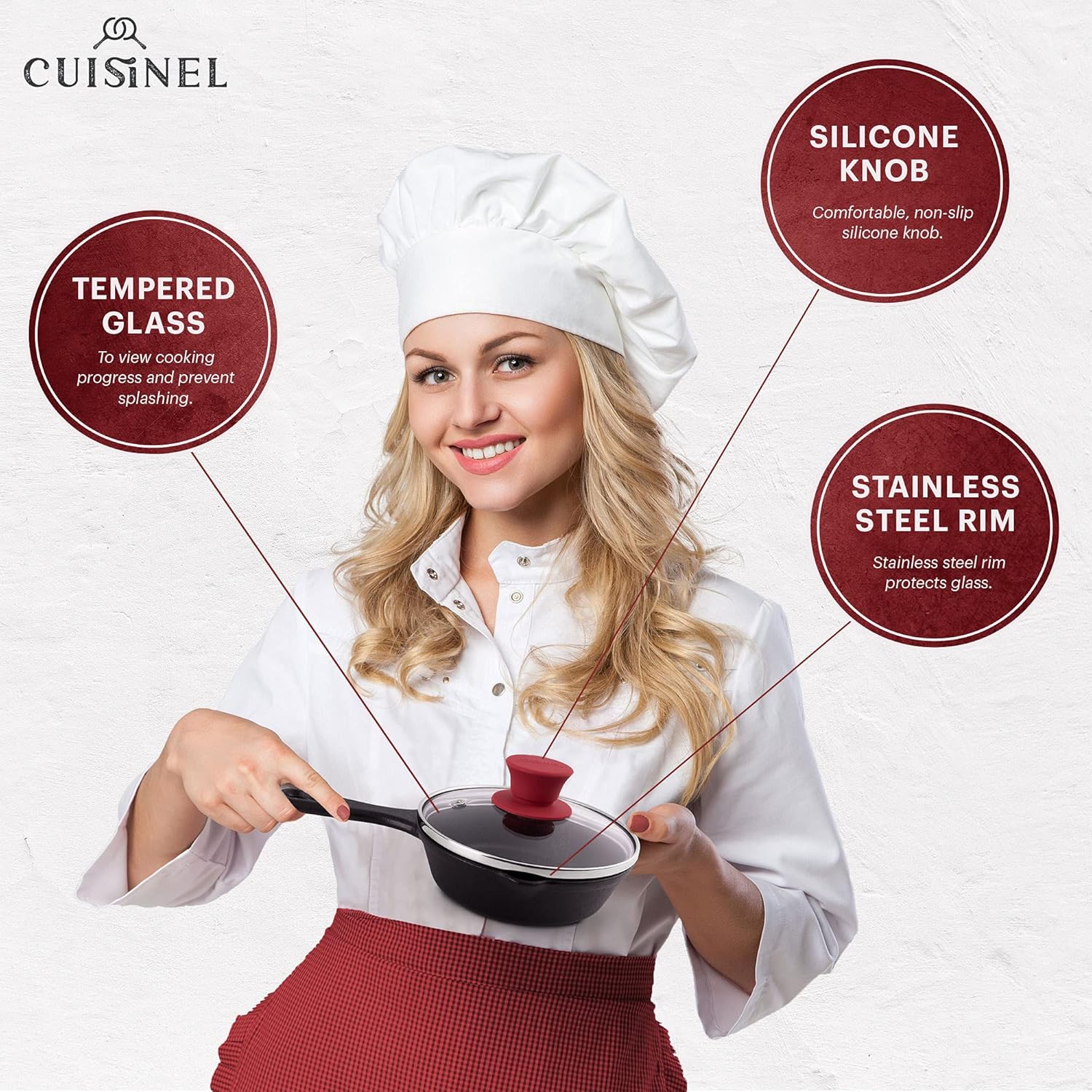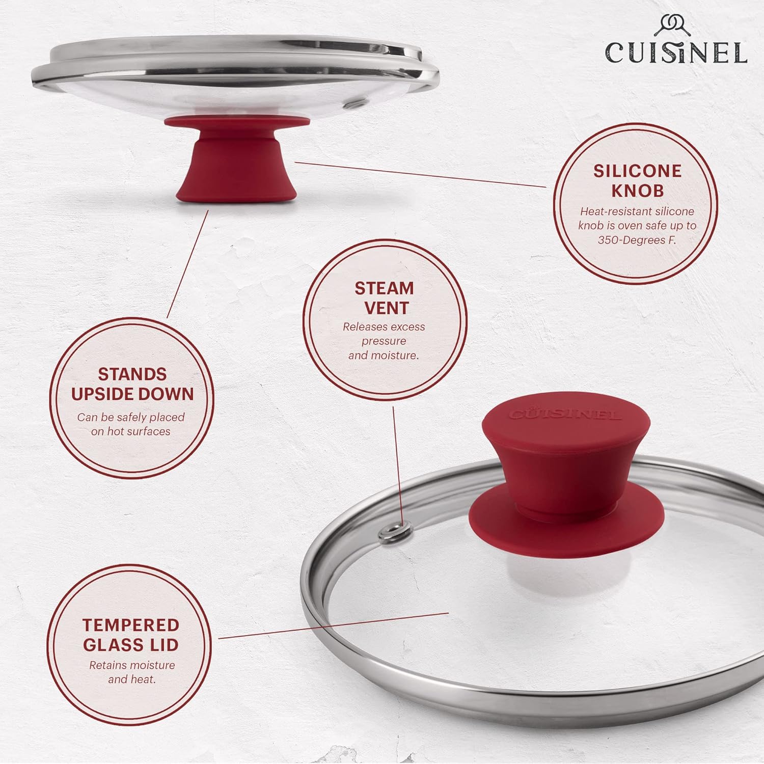 - STEAM VENT HOLE: Cuisinel's professional quality lids – now updated with steam vent holes to prevent liquid from boiling over. Vent holes allow just the right amount of moisture to evaporate easily so your food doesn't saturate in liquid. Vent holes make sure the glass lid doesn’t cloud up – allowing you to easily see cooking progress without removing lid.