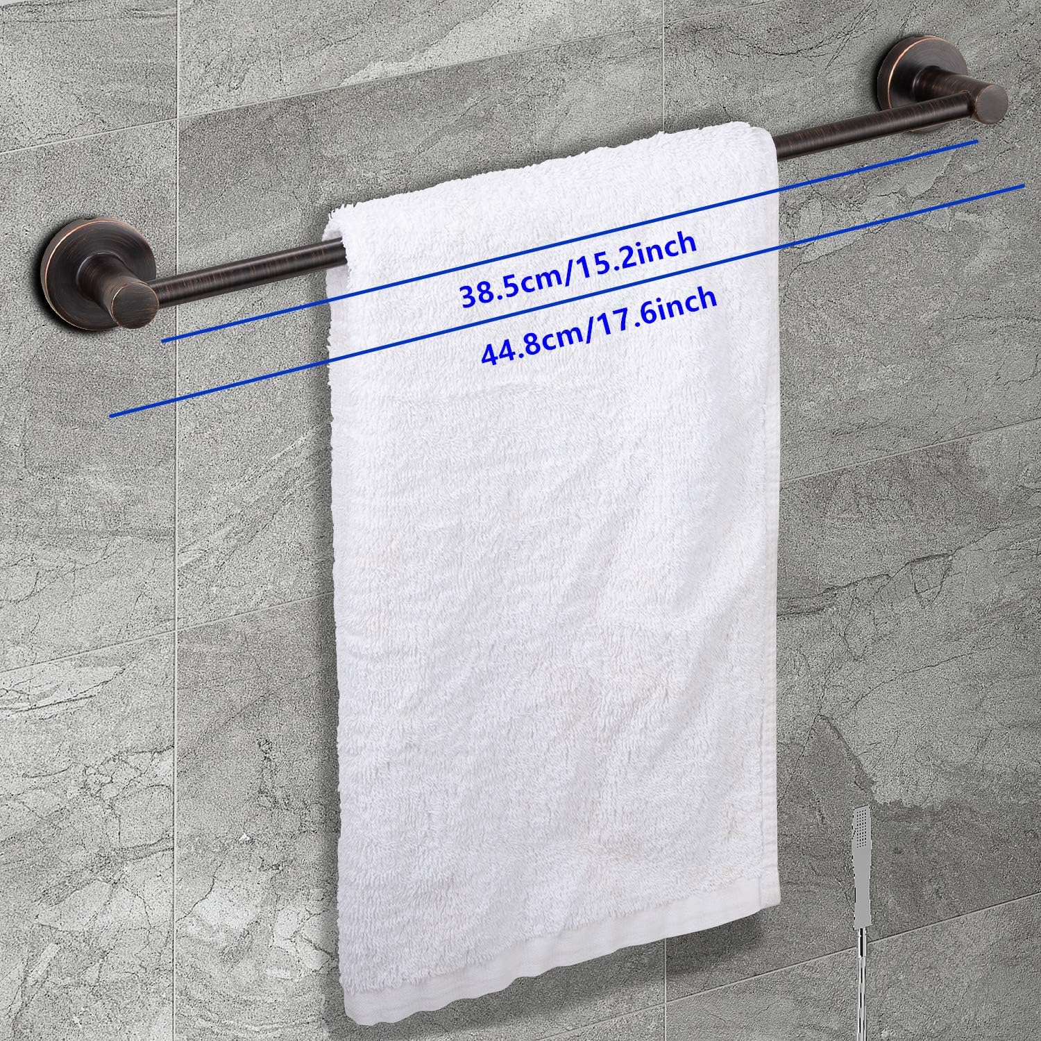 - DIMENSIONS:Overall length is 17.6". The length of hanging space is 15.2" (385mm). 22-Lbs (10kgs) max weight capacity. This towel bar can be used in kitchens, baths, and laundry rooms, you can mount it to either side of your cabinet or closet door for storing at-use hand and dish towels.