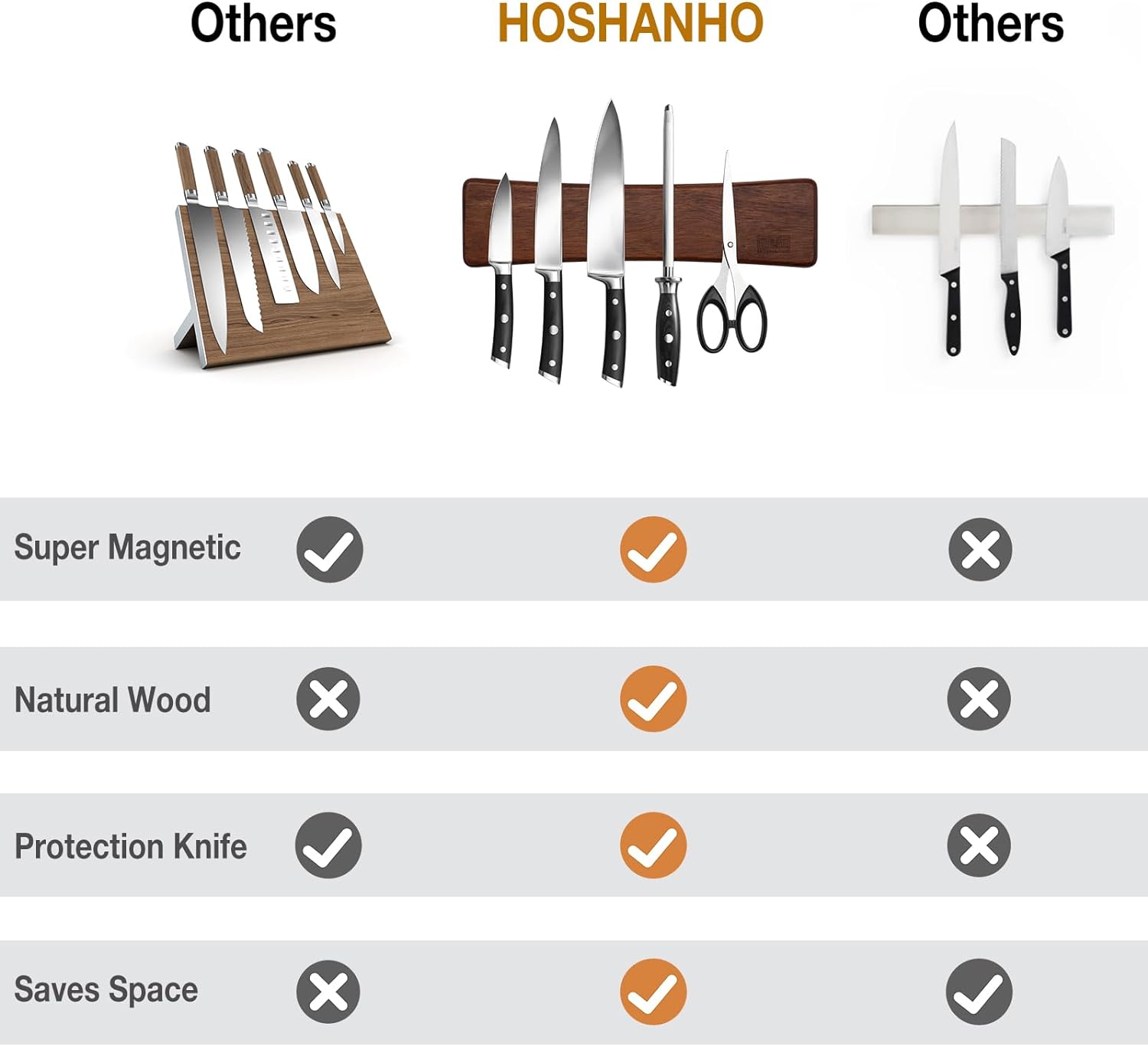 - 【Acacia Wood & Super Strong Magnet】HOSHANHO magnetic knife strip is made from top-quality acacia wood and built-in two rows of powerful magnets running through the entire strip, stronger adsorption force allow even your largest knives to hang safely and securely, ultra sturdy and easy to clean up.