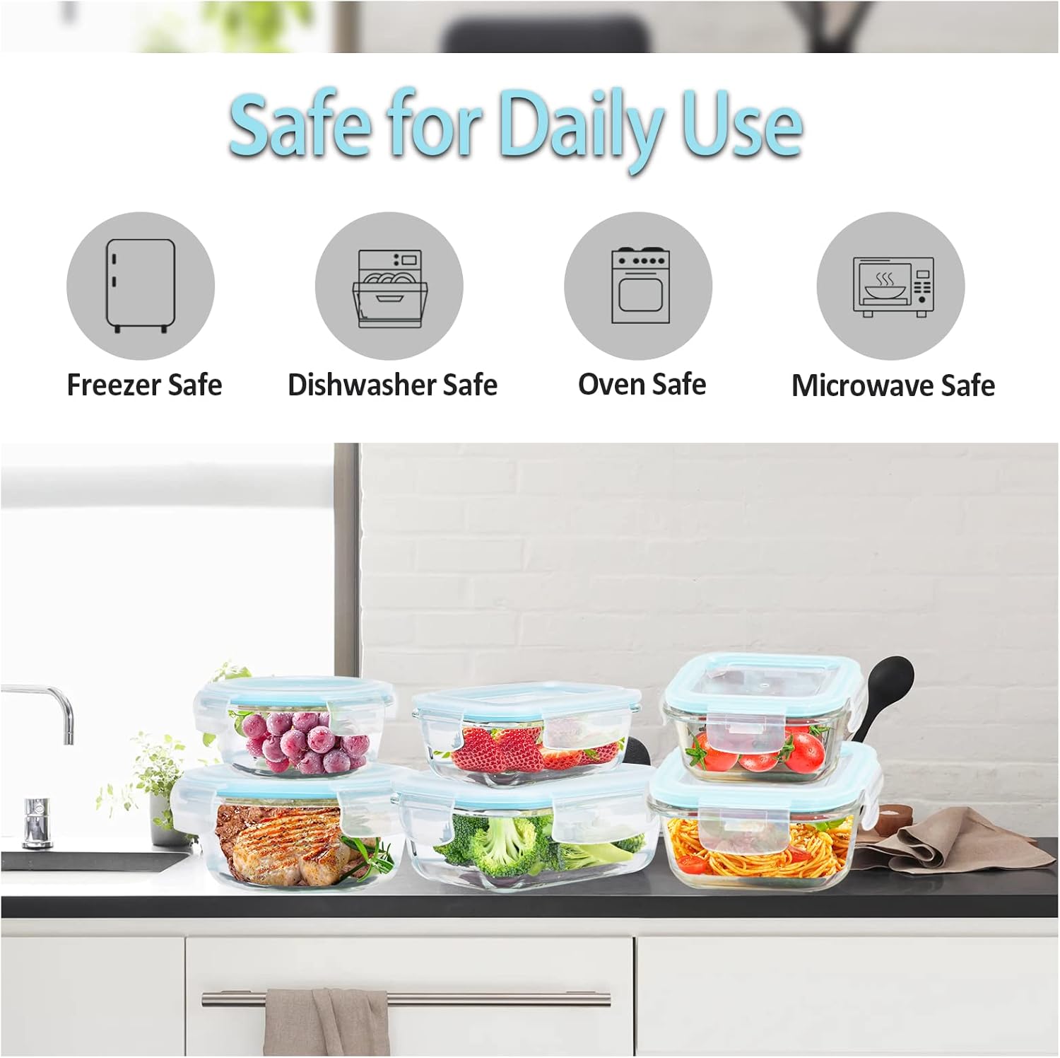 Glass Food Storage Containers with Lids Airtight 6 Pack, Glass Storage Containers with Lids for Food, Not Easy Broken & Leak Proof, Oven/Dishwasher Safe, Blue