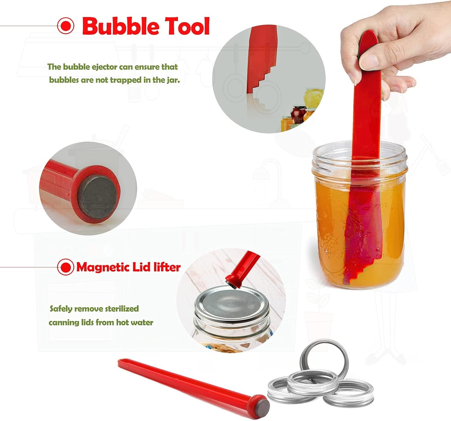 - [Magnetic Lid Lifter and Wide mouth Funnel] Magnetic Lid Lifter designed to lift HOT jar lids safely preventing damage to seal strips on lid undersides during transfer out of BOILING water. Wide mouth Funnel helps transfer of jams, jellies MESS free, QUICK, and EASY.