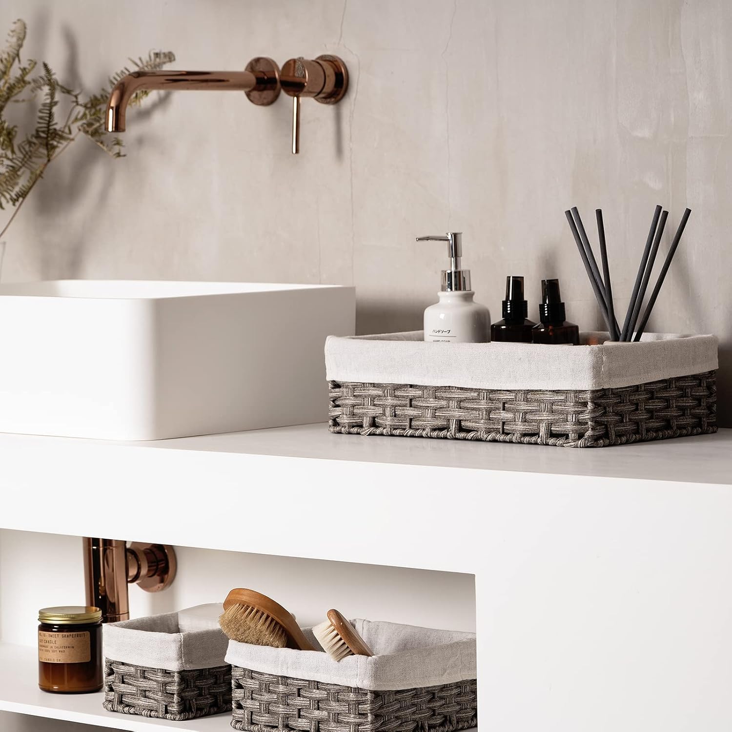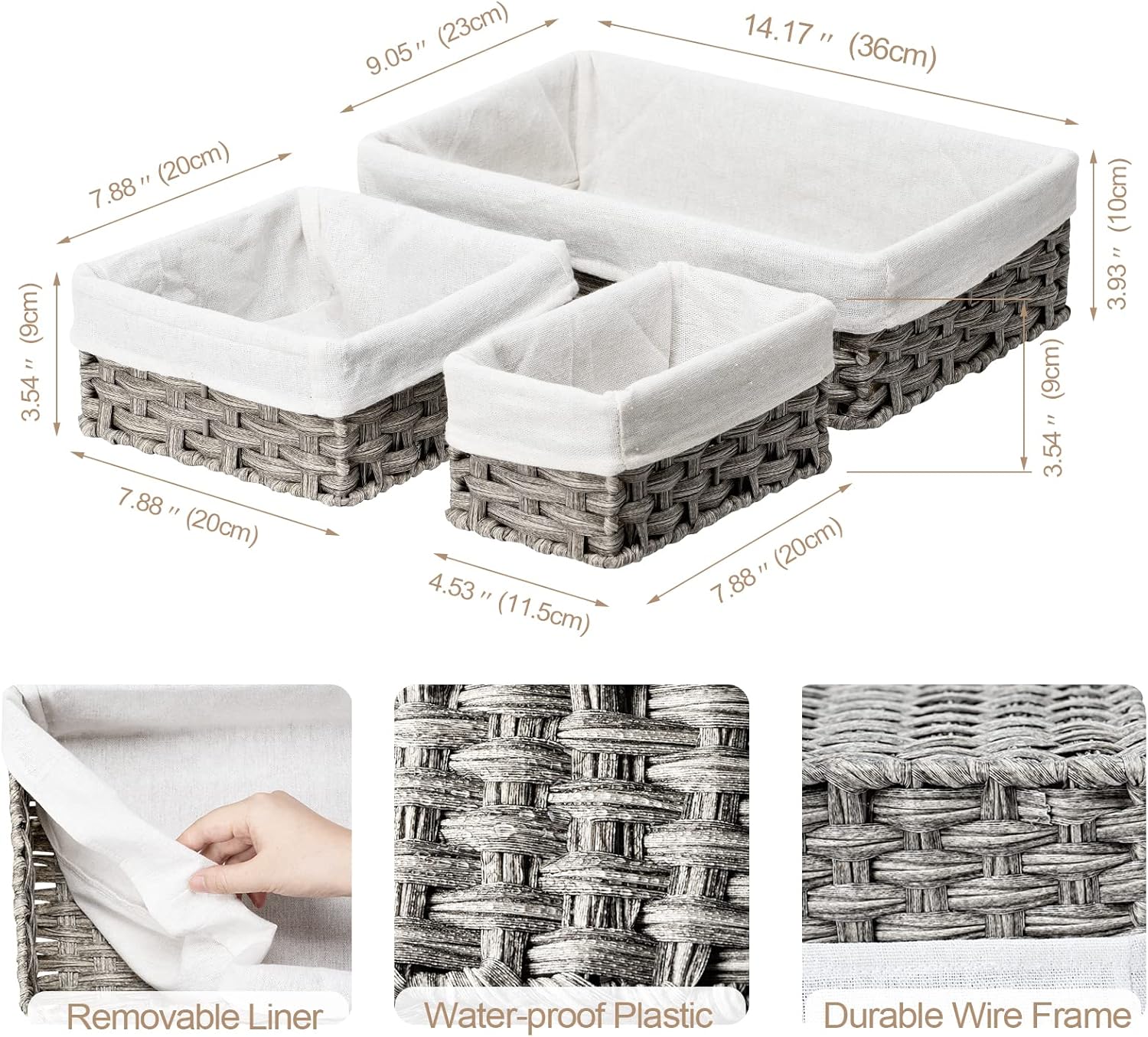 FairyHaus Wicker Baskets for Organizing 3 Pack, Waterproof Small Wicker Storage Basket for Shelves Rectangle, Nesting Lined Grey Plastic Woven Basket