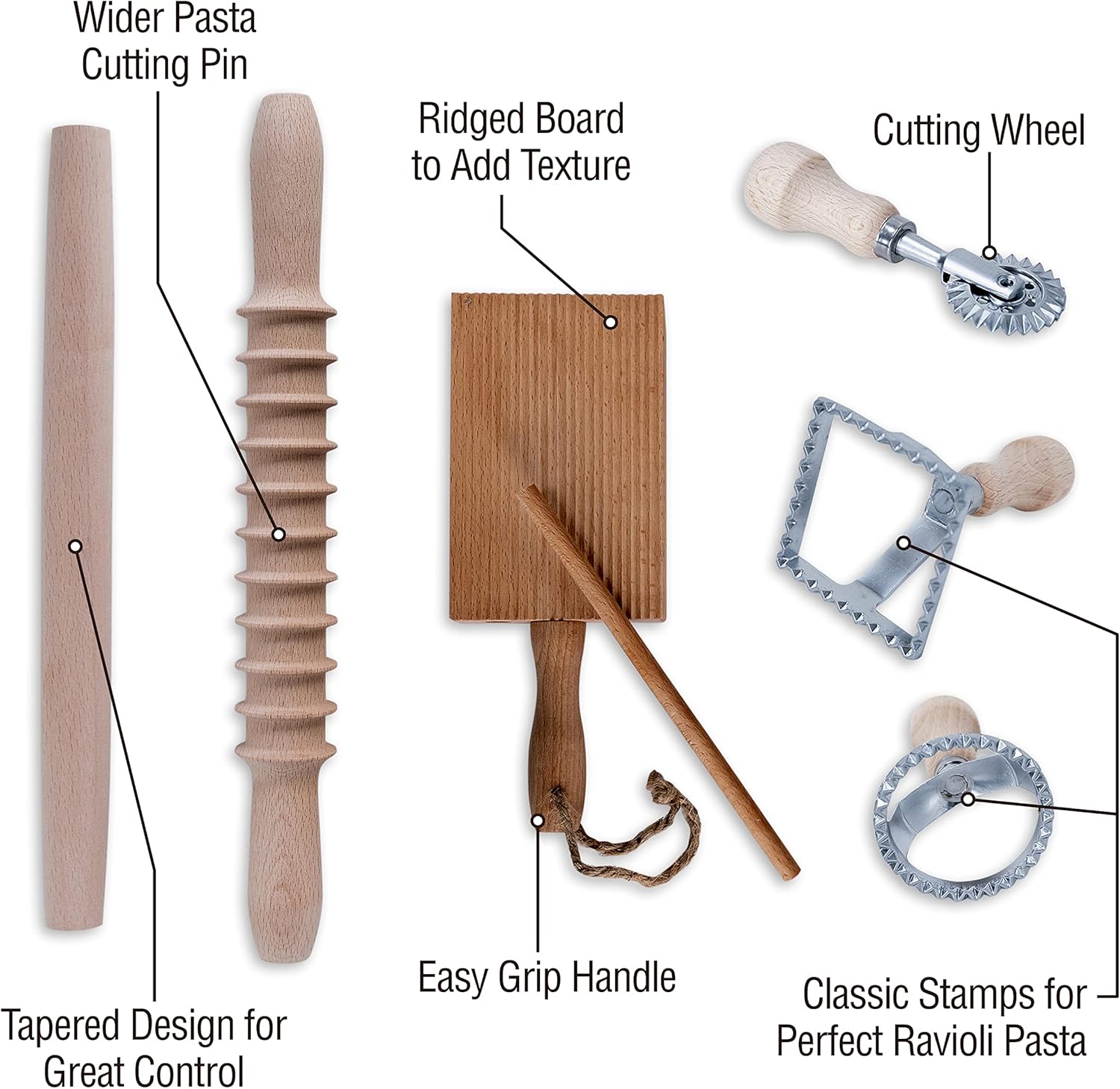 Complete 6 Pcs Pasta Making Tool Set Includes Two Ravioli Stamp Maker Cutter And Roller Wheel Set, Two Pasta Rolling Pins, Gnocchi Board By Cotswold Homeware Co