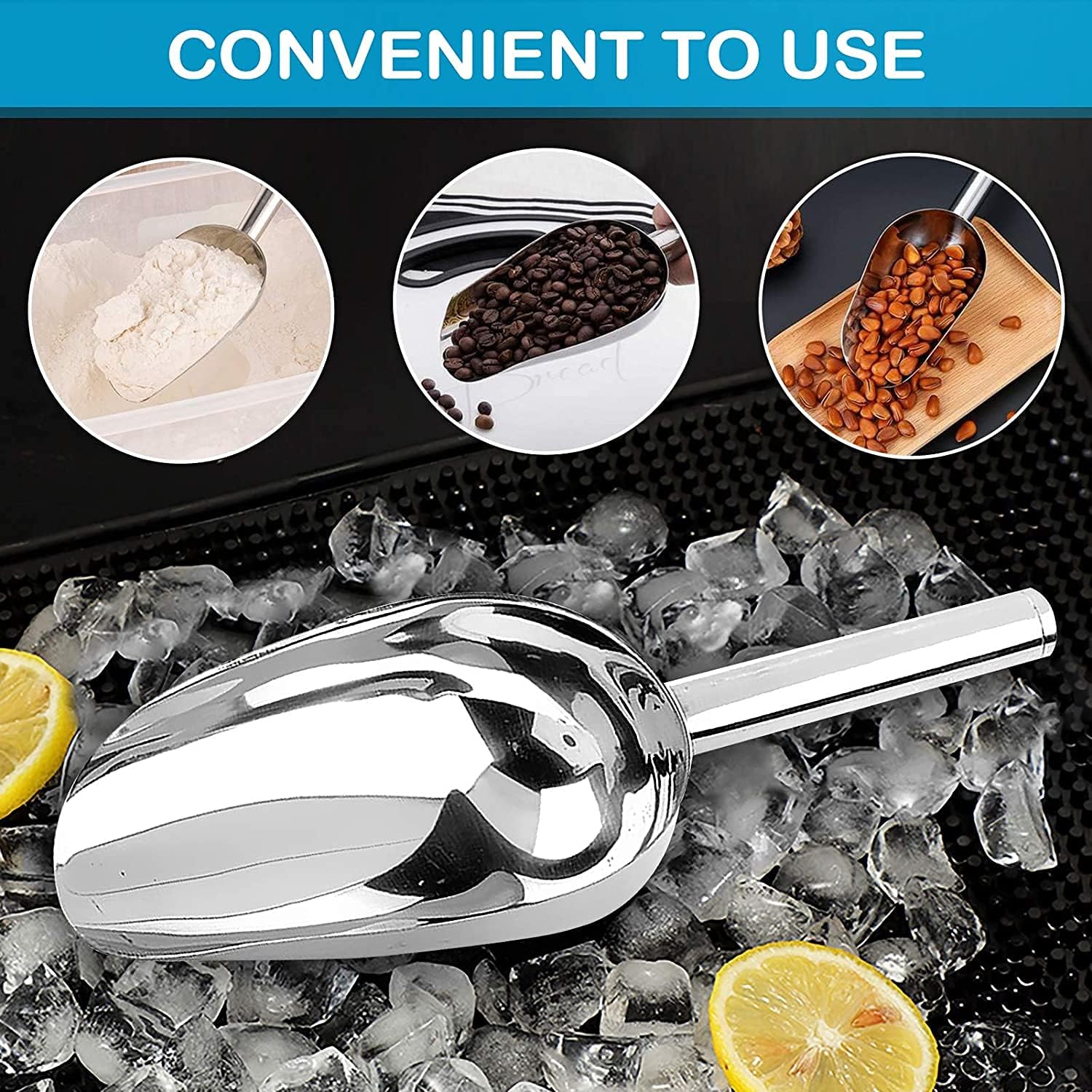 - MULTI-PURPOSE USE;The all purpose scoop is widely used in kitchen,bar,buffet,party,wedding,drink shop etc.Great for ice, food, coffee bean, popcorn, flour,candy,cat litter,as so as dog poop scoop,etc.