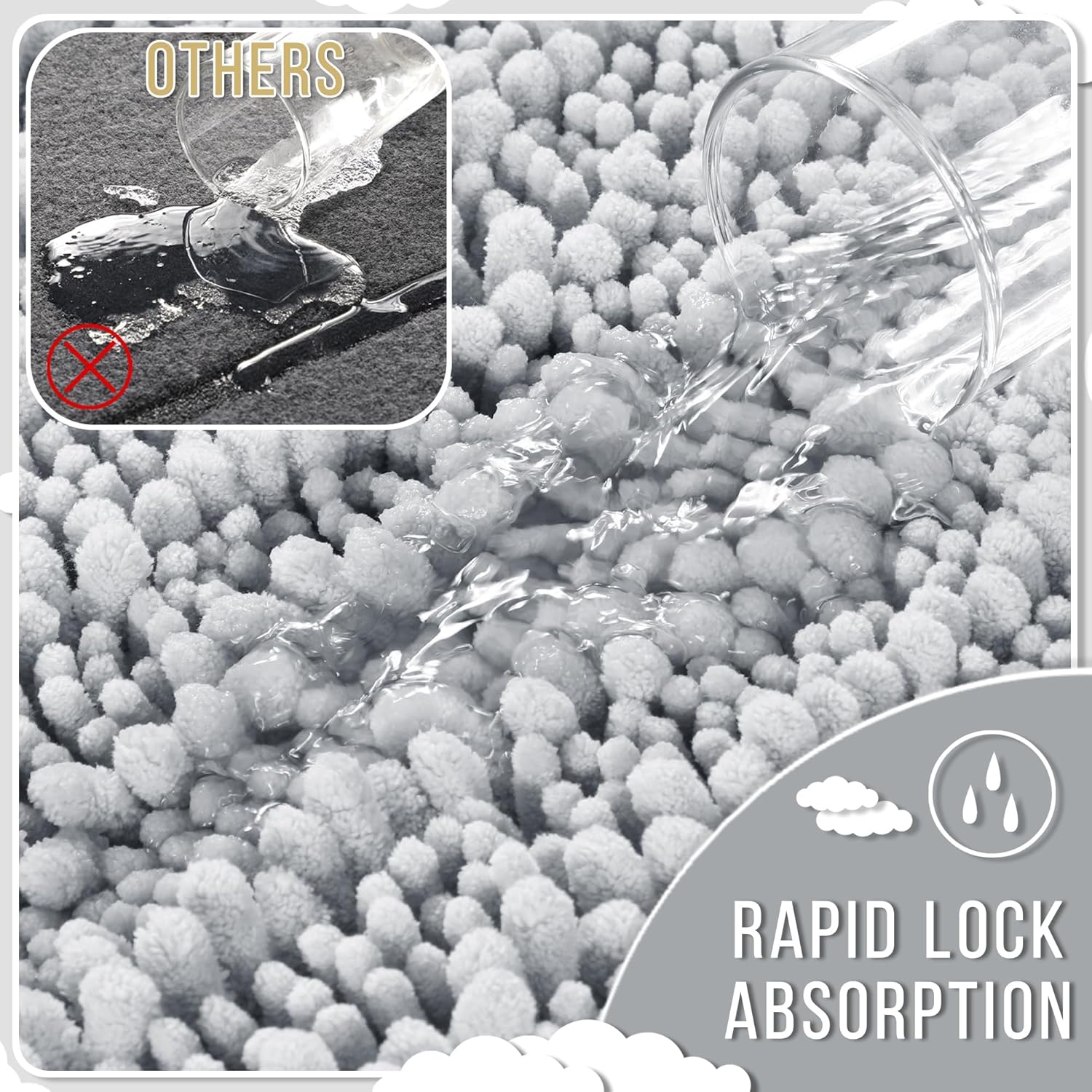 - Massive Water Absorption in Seconds: 5X faster than other materials mats, Yimobra bath mat absorbs 1000ml of water in 3 seconds. The vertical fiber channels lock moisture away from the surface, keeping your bathroom floor dry and discouraging damp environments. Perfect as a shower exit guard or sink splash catcher