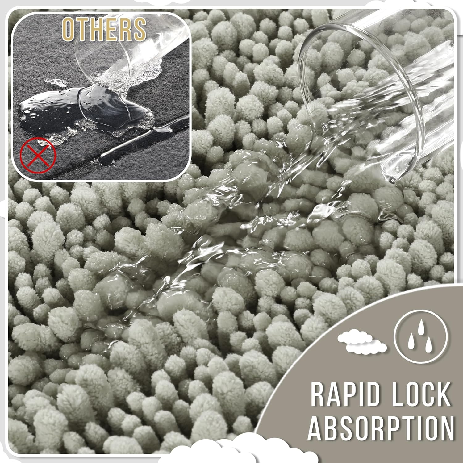 - Massive Water Absorption in Seconds: 5X faster than other materials mats, Yimobra bath mat absorbs 1000ml of water in 3 seconds. The vertical fiber channels lock moisture away from the surface, keeping your bathroom floor dry and discouraging damp environments. Perfect as a shower exit guard or sink splash catcher