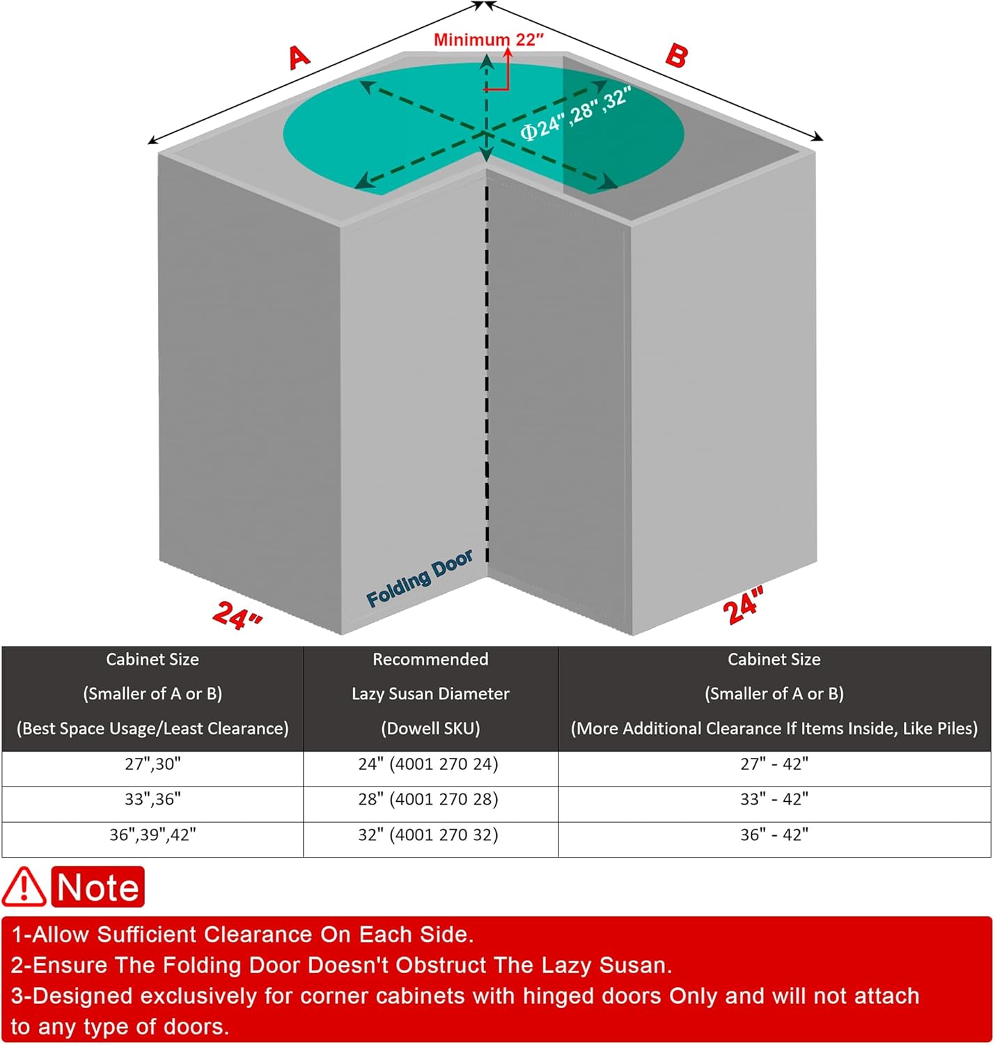 - DESIGNED FOR BASE CORNER CABINETS: Each shelf is kidney shaped (also called pie shaped or 270 degrees) in order to fit easily inside a base corner kitchen cabinet with a hinged diagonal door. The actual diameter of the lazy susan is 32" so the ideal cabinet size is 36" with an internal clearance of 39-42". No part of the lazy susan will attach to the door. Final assembly must be completed inside the cabinet to ensure fit.