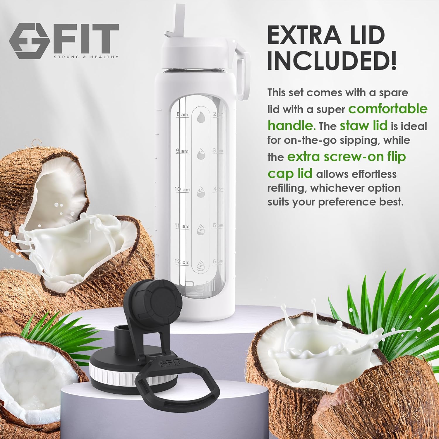 FIT Strong & Healthy 32 oz Glass Water Bottle with Straw Lid, Time Marker, Sleeve & Extra Lid - Motivational, Wide Mouth 1 Liter Glass Drinking Bottle