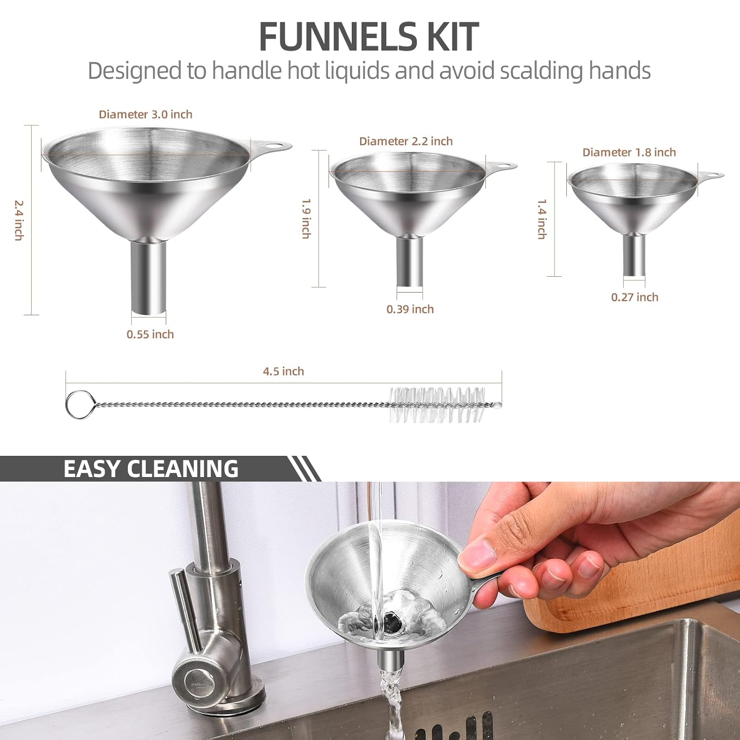 - Easy to Clean & Store - Our mini funnels are very easy to clean especially with the small brush that comes with this small funnel set. The clip ring help these small funnels keep together for storage. Funnels in 3 size are great for filling any size of jar, bottle or flask.