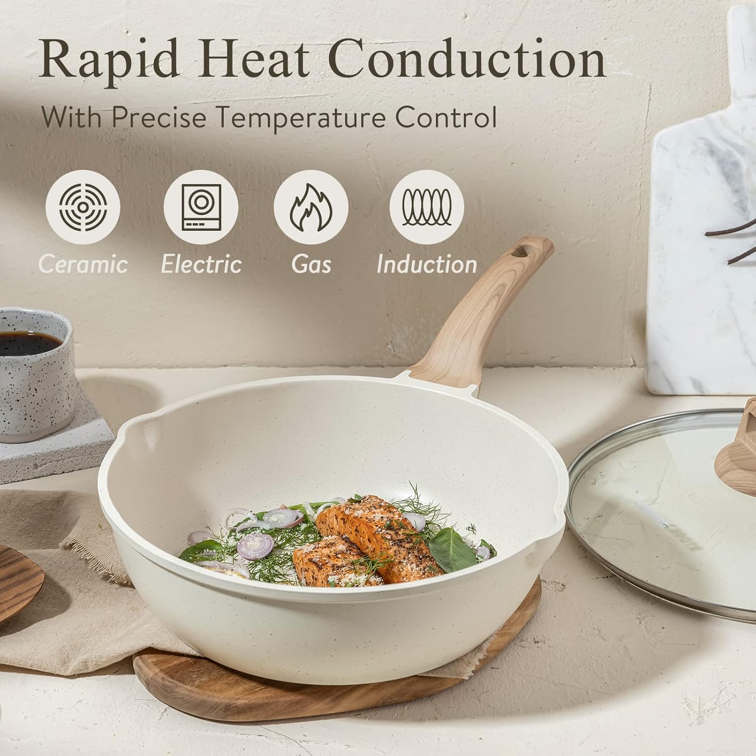 - [Superior Nonstick Performance] - Our saute pan, made with natural granite materials, provides superior nonstick performance with 100% PFOA Free and non-toxic properties. Enjoy healthier cooking with less oil intake. Advanced technology ensures a long-lasting and naturally nonstick surface that effortlessly releases food.