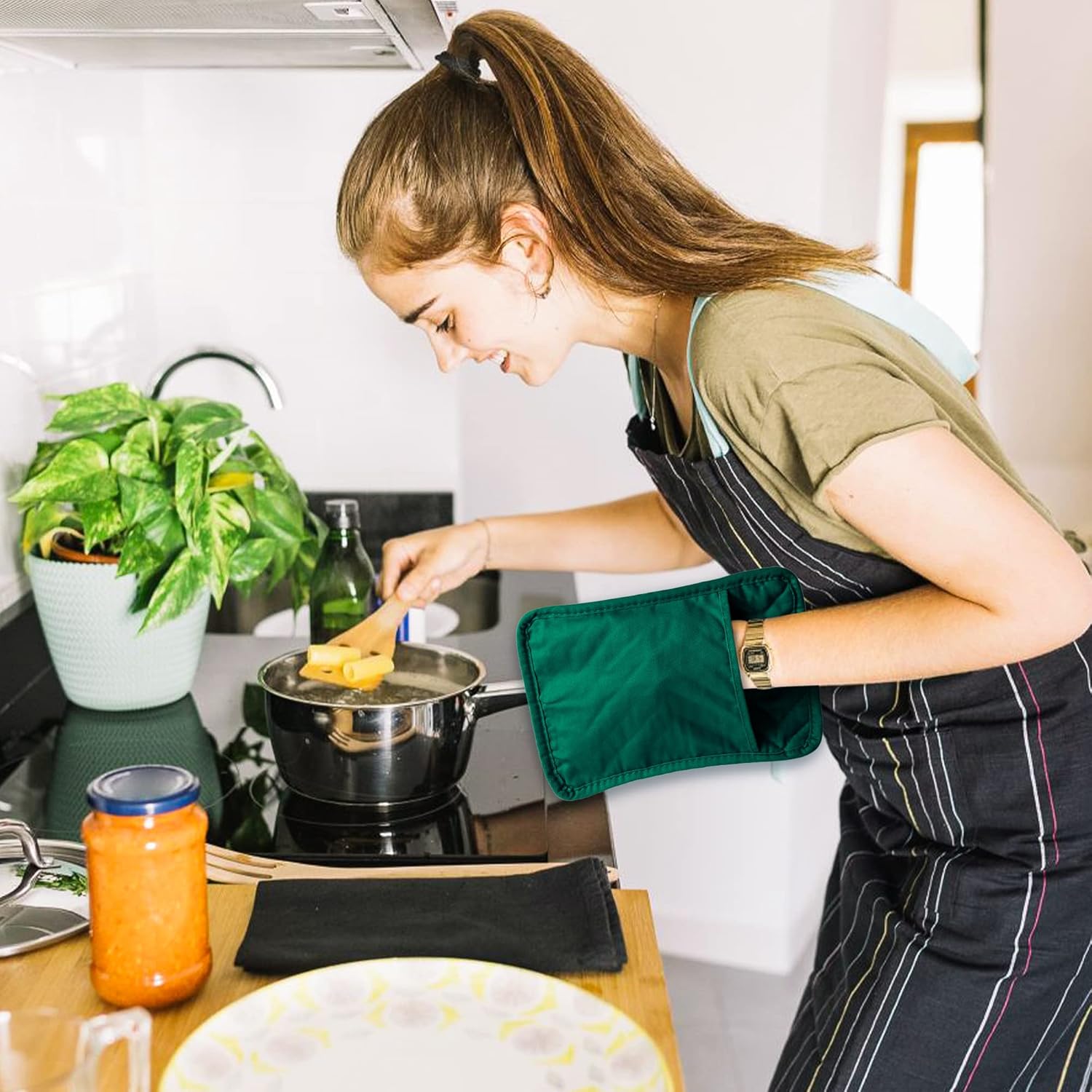 - Great Value Set -- 5 pack large size cotton pot holders(Includes 2 green pot holders & 3 red pot holders), meet all need of your kitchen! Ideal for hot pan holder, microwave splatter guard, spoon rest, jar opener, trivet, large coaster.