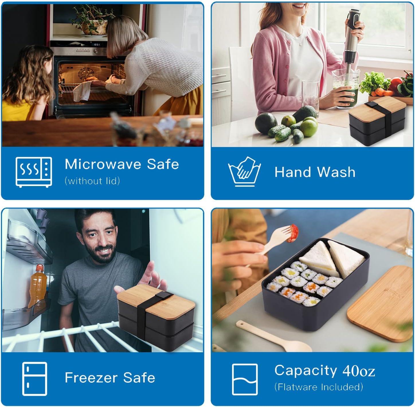 Japanese Bamboo Bento Box with Compartments and Utensils Stackable Lunch Box Includes Lunch Bag for Meal Prep Black