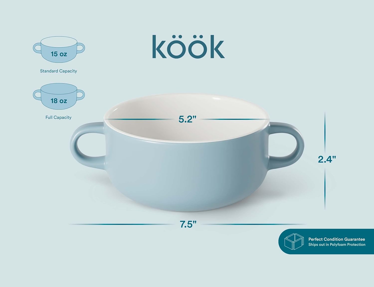 KooK Soup Crocks, Ceramic Bowls, Broil, Oven, Microwave and Dishwasher Safe, with Handles, For Casserole, Pasta, Cereal, 18 oz, Set of 4 (Pale Blue)