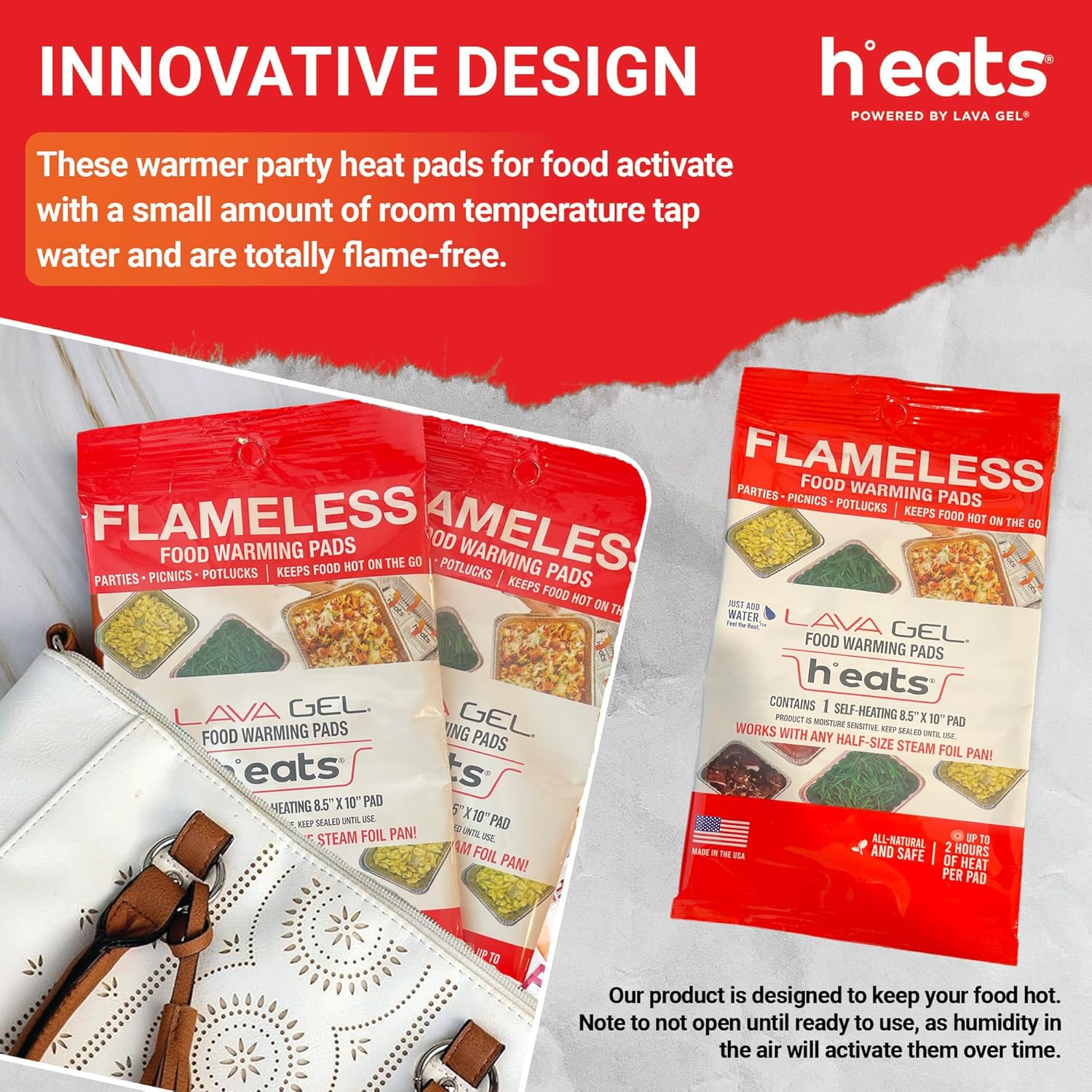 - Easy to Use: Simply add tap water to your chafing dish or aluminum pan and place the h°eats pad inside, then add your food on top in the same size pan. These self-contained and reliable warmers keep your food warm for events and other occasions.