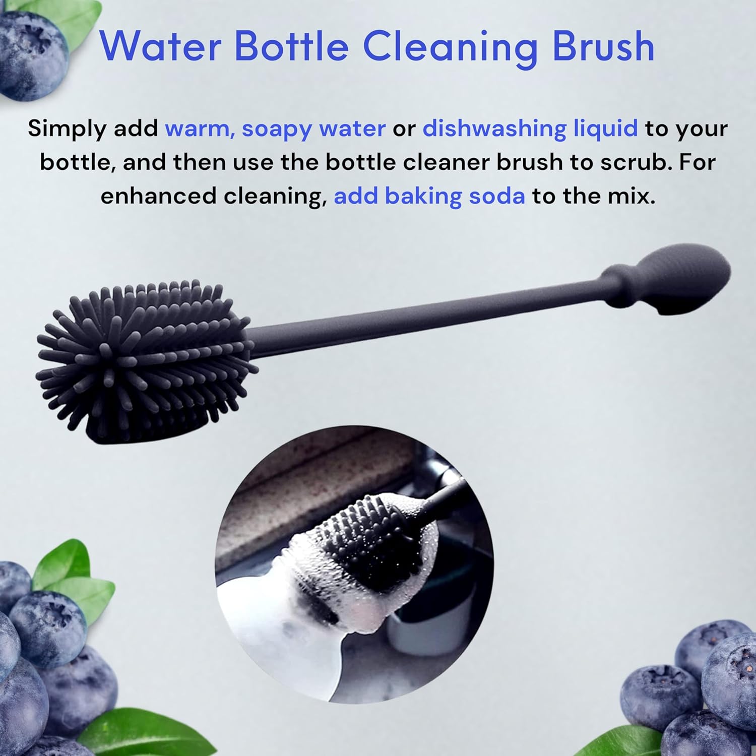 - Water Bottle and Cleaning Brush Set: Upgrade your hydration routine with our 32 oz Glass Water Bottle with Time Marker and Cleaning Brush Set; this version features an extra thick silicone sleeve for extra protection, insulation, and a secure grip; we've also upgraded one of the lids to a straw lid for sipping on the go; the 32-inch Water Bottle Brush is made from durable silicone material, which effectively removes dirt and residue; plus, it does not absorb unpleasant odors and stains